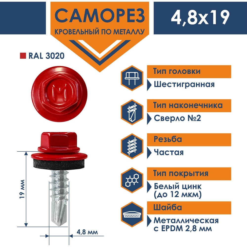 Кровельный саморез Daxmer 4,8x19 мм, RAL 3020, сверло №2, 400 шт. 00000316794