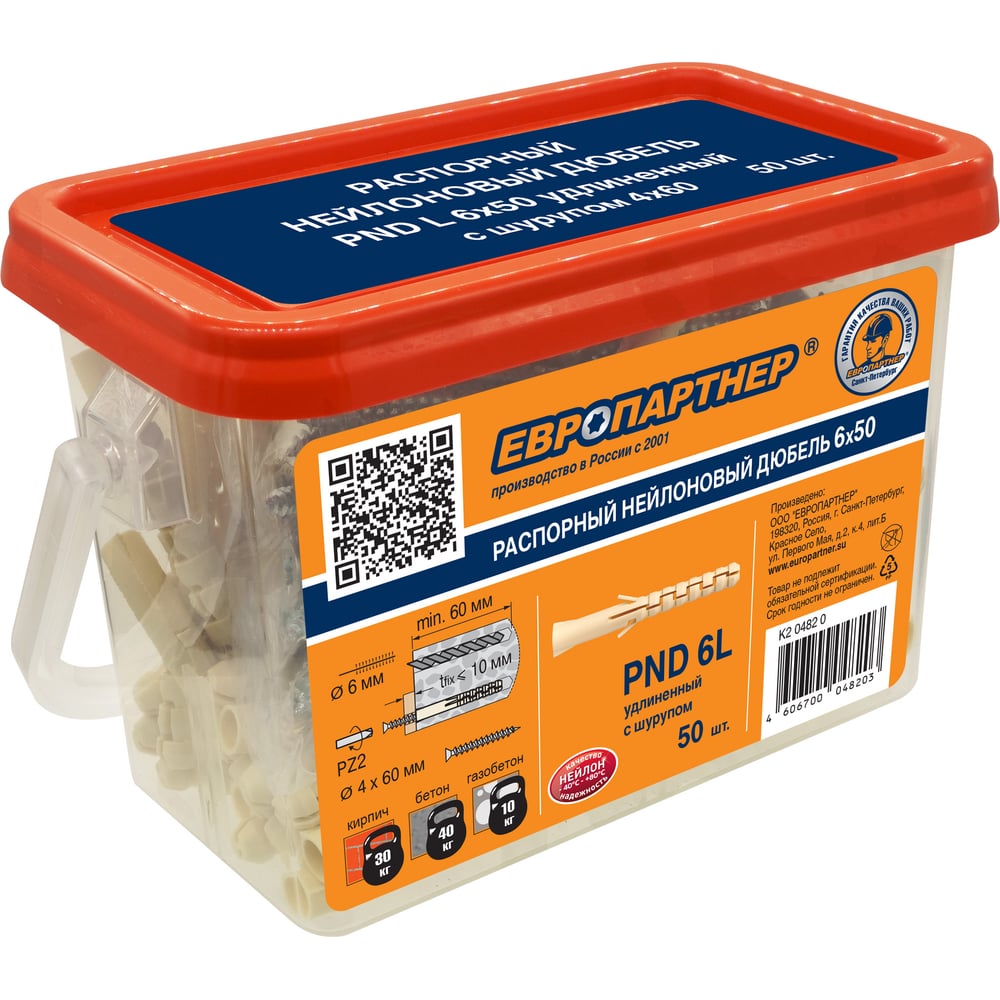 Дюбель ЕВРОПАРТНЕР распорный нейлоновый PND 6х50 с шурупом 4,0х60 50 шт. K2 0482 0