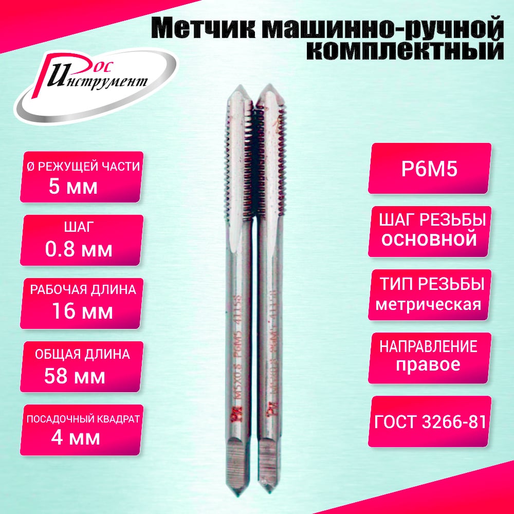 Метчик машинно-ручной РОСИНСТРУМЕНТ М5.0x0.8 ГОСТ 3266-81 Р6М5 комплектный 2 шт. 41158