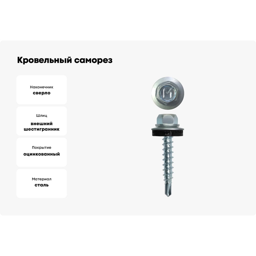 Длина 38 мм DIN нет Тип фасовки шт. Материал сталь Покрытие оцинкованный Диаметр 6.3 мм ISO нет ГОСТ нет Наличие пресс-шайбы есть Нержавеющая сталь нет Цвет покрытия белый цинк Форма головки шестигранная Шлиц внешний шестигранник Наконечник сверло Цвет RAL нет Фасовка 40 шт