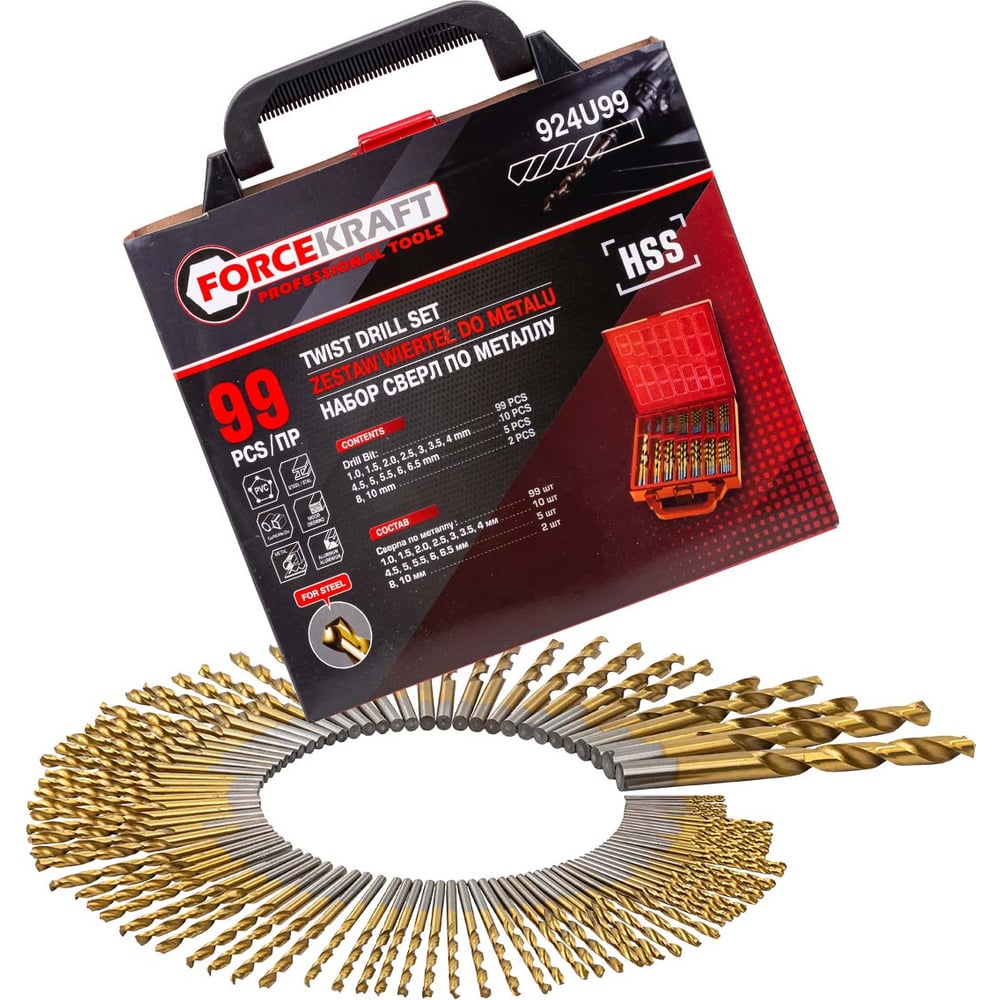 Набор сверл по металлу HSS, 99 шт, 1,1.5,2,2.5,3,3.5,4 мм по 10 шт; 4.5,5,5.5,6,6.5 мм по 5 шт; 8,10 мм по 2 шт),в кейсе Forcekraft FK-924U99(51910)