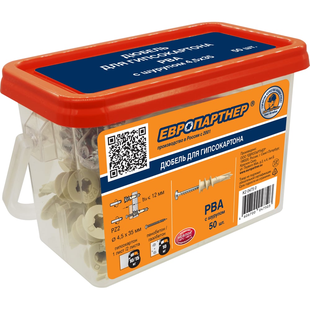 Дюбель ЕВРОПАРТНЕР винтовой для листовых материалов нейлоновый PBA с шурупом 4,5х35мм 50 шт. K2 0475 0