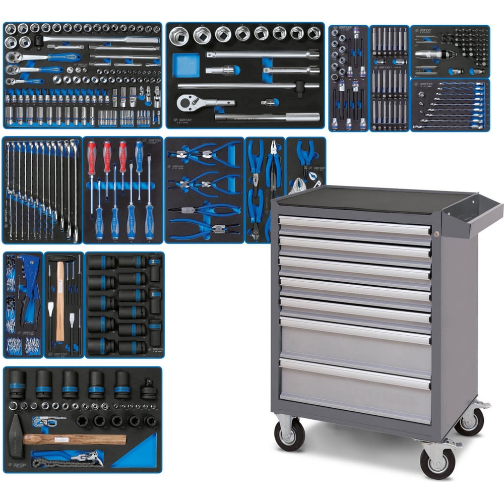 Высота 955 мм Длина 680 мм Ширина 460 мм Цвет серый Класс товара Профессиональный Вес нетто 112.15 кг Количество полок 1 Количество ящиков 7 Количество предметов 327 Система хранения ящик Инструмент в комплекте есть
