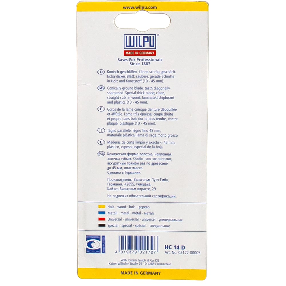 Wilpu пилка hc 14 d х5шт/уп для дерева до 45мм и пластмассы прямой, чистый рез 217200005