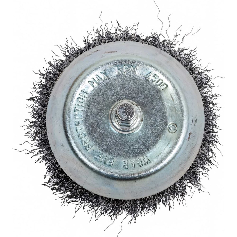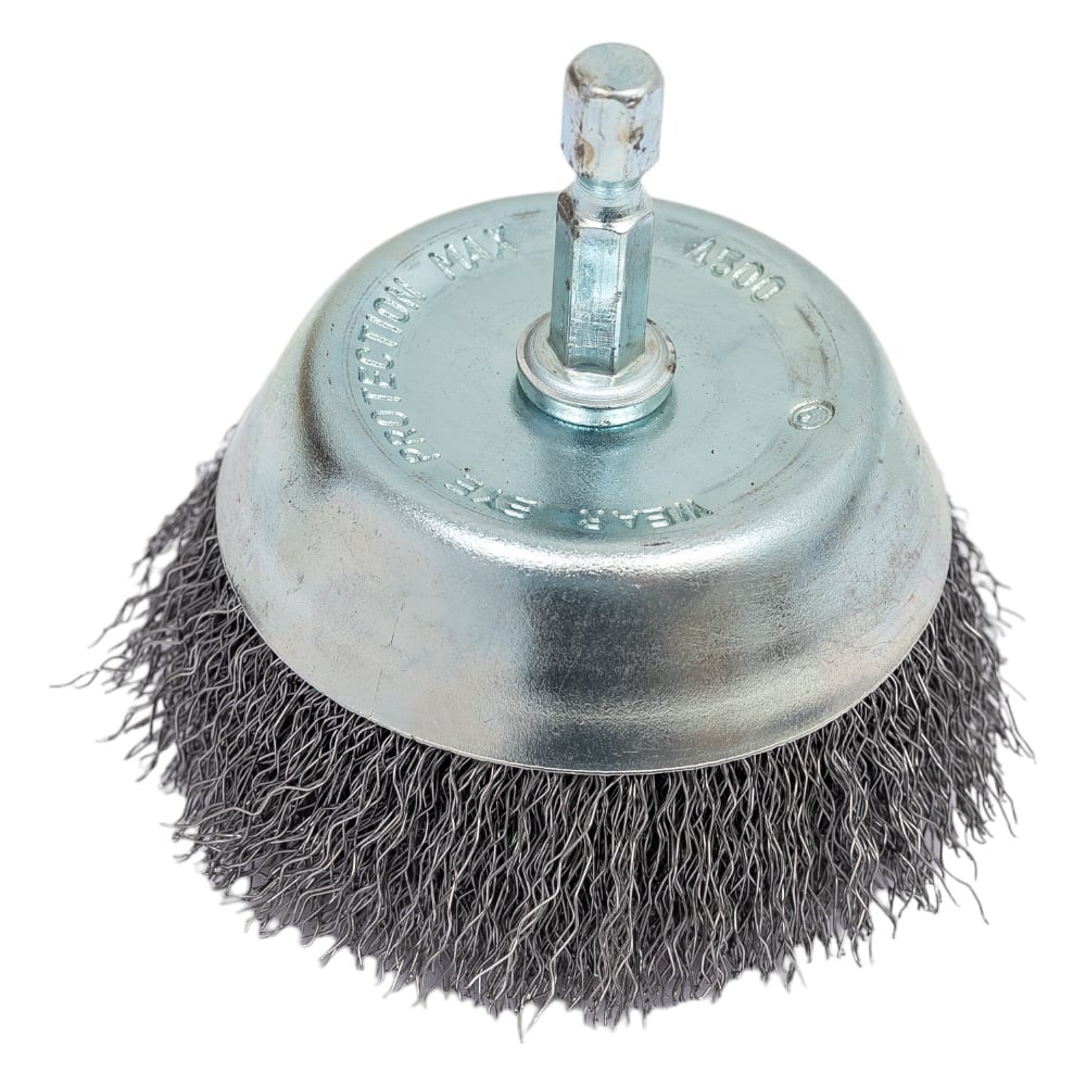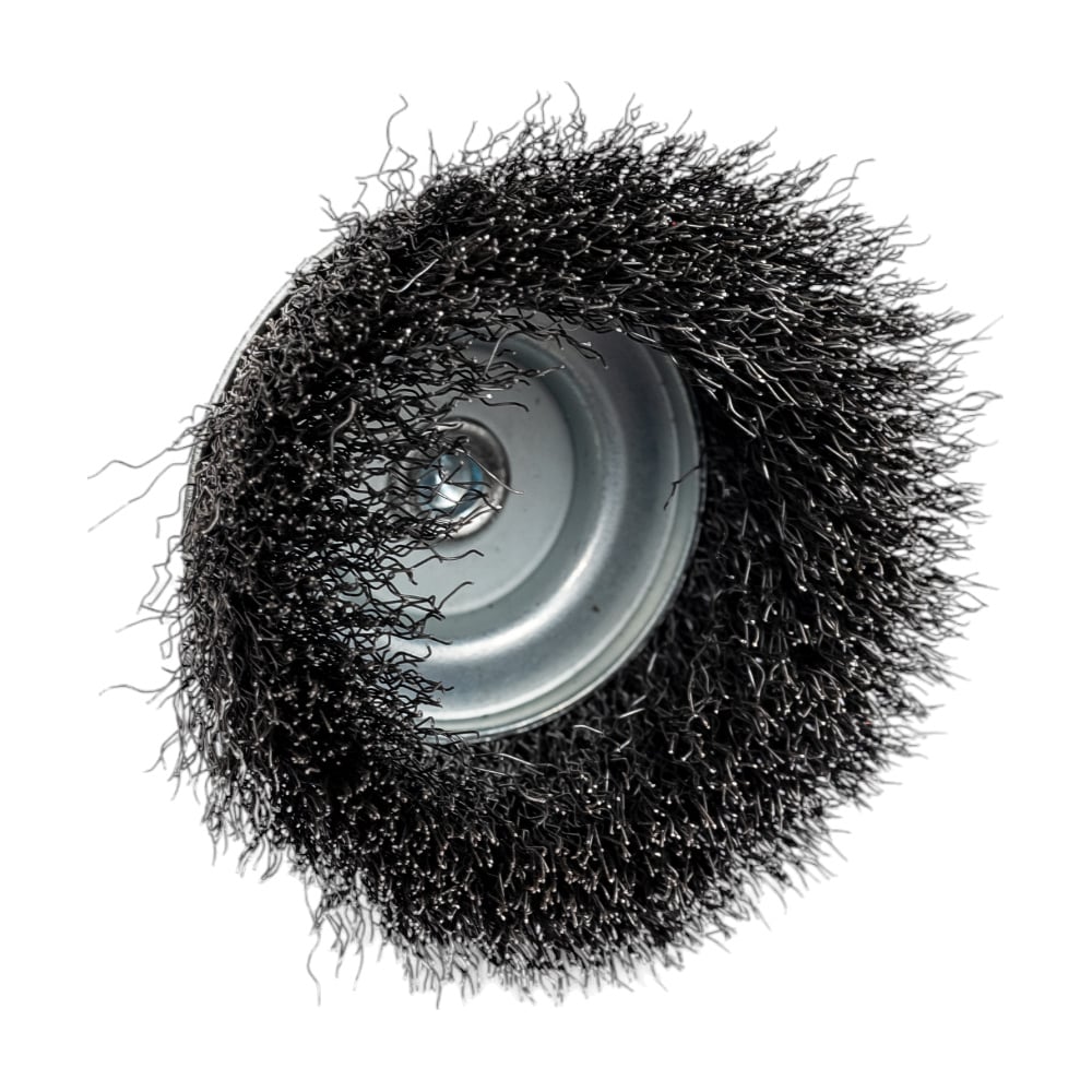 Щётка чашеобразная, гофрированная стальная проволока №085 (75 мм; хвостовик шестигранный) для дрели Атака 22389