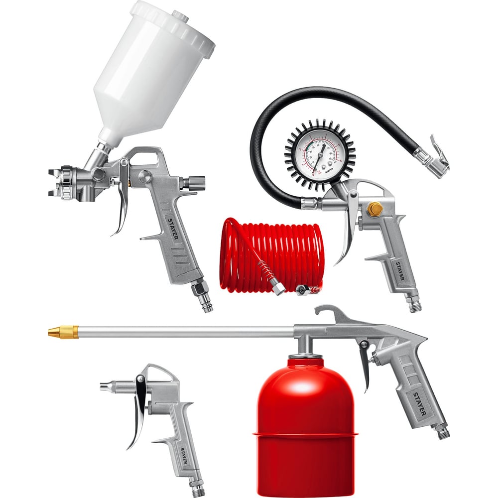 | В наборе | краскораспылитель с верхним бачком; пистолет для нанесения защитных покрытий; продувочный пистолет; пистолет для подкачки шин; пневмошланг |