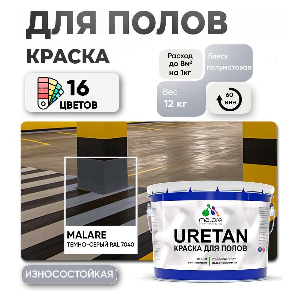Краска MALARE URETAN для пола, полуматовая, темно-серая, 12 кг 2015222564061