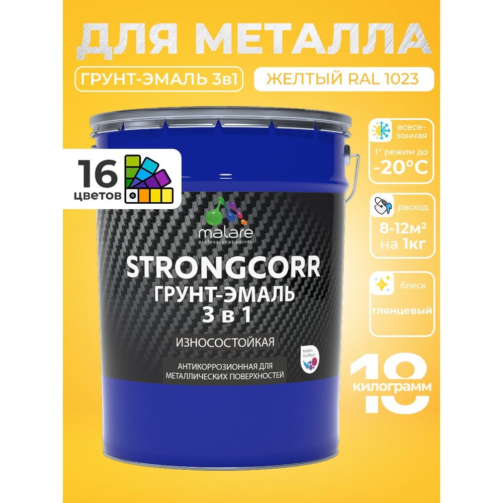 Грунт-Эмаль 3 в 1 по ржавчине MALARE StrongCorr, алкидно-уретановая, глянцевая, желтый, 18 кг 7930085243265 ГЭСТР1023Г1800