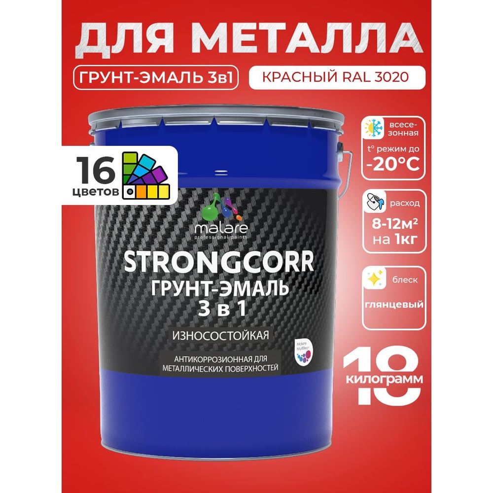 Грунт-Эмаль 3 в 1 по ржавчине MALARE StrongCorr, алкидно-уретановая, глянцевая, красный, 18 кг 7930085243388 ГЭСТР3020Г1800