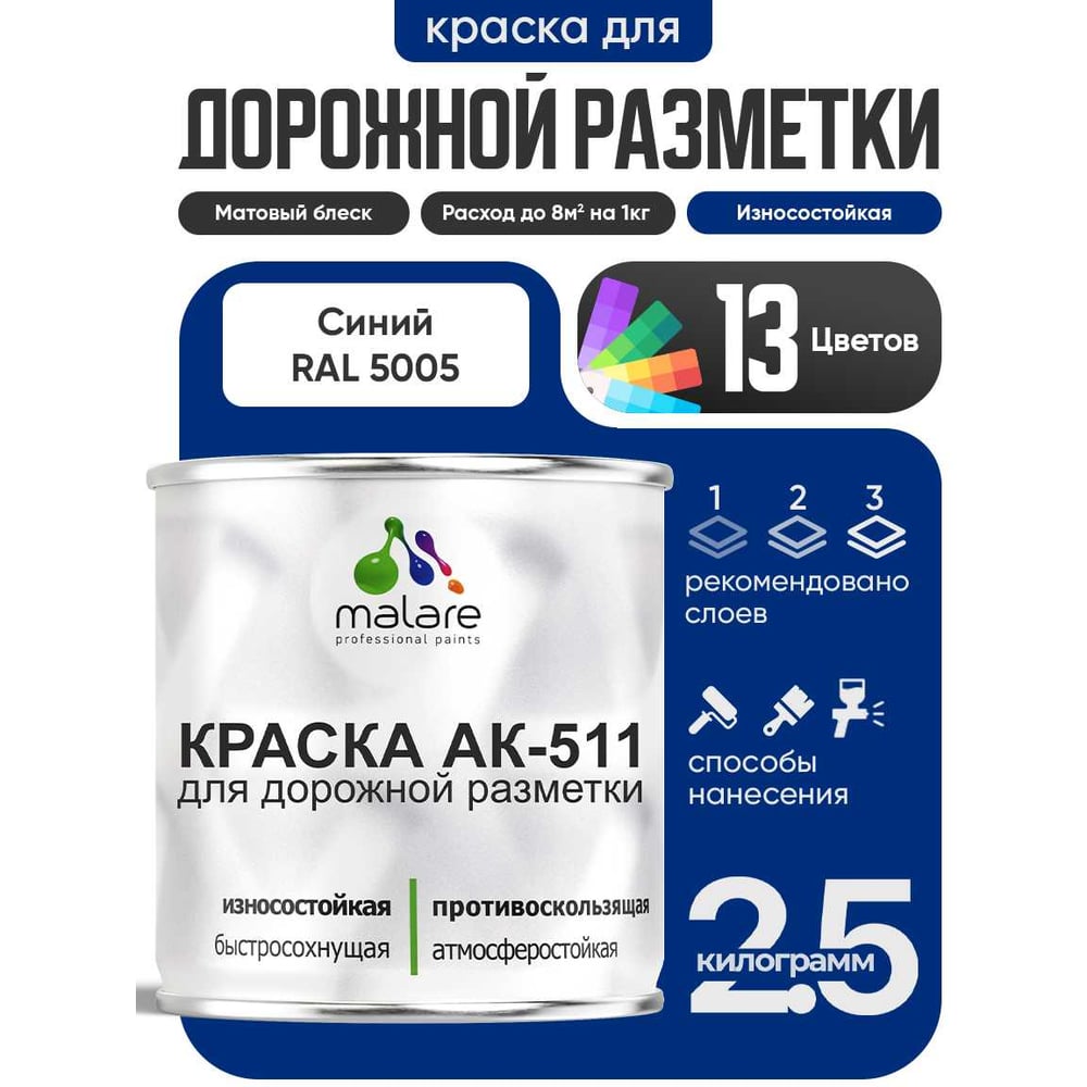 Краска MALARE АК-511 для дорожной разметки, синий, 2,5 кг КАК5115005М0250