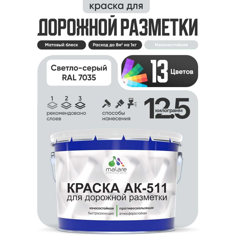 Краска MALARE АК-511 для дорожной разметки, светло-серый, 12,5 кг КАК5117035М1250