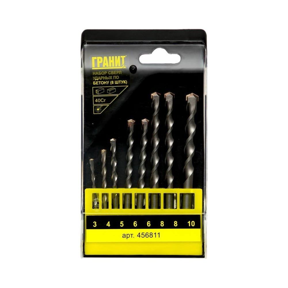 Гранит набор сверл ударных по бетону из 8 штук 3,4,5,6,6,8,8,10мм 456811