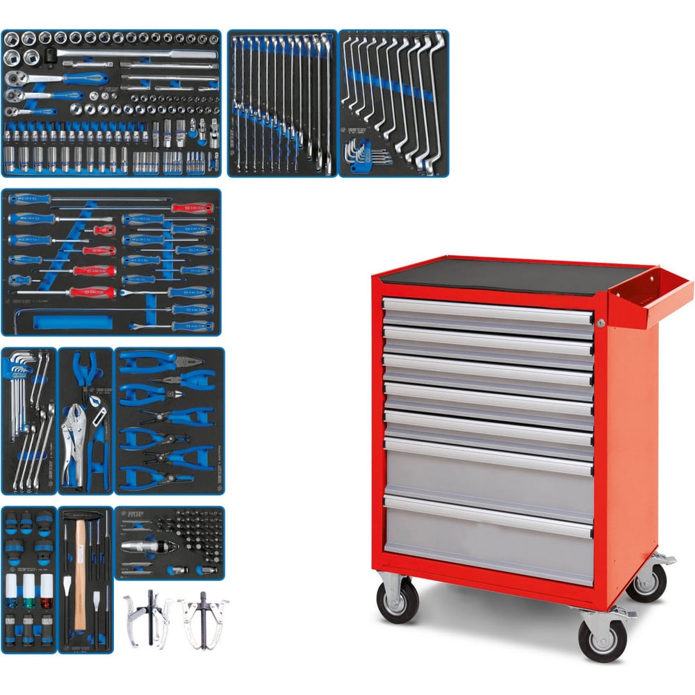 Высота 955 мм Длина 680 мм Ширина 460 мм Цвет красный Класс товара полупрофессиональный Вес нетто 83.14 кг Количество полок 1 Количество ящиков 7 Количество предметов 251 Система хранения ящик Инструмент в комплекте есть