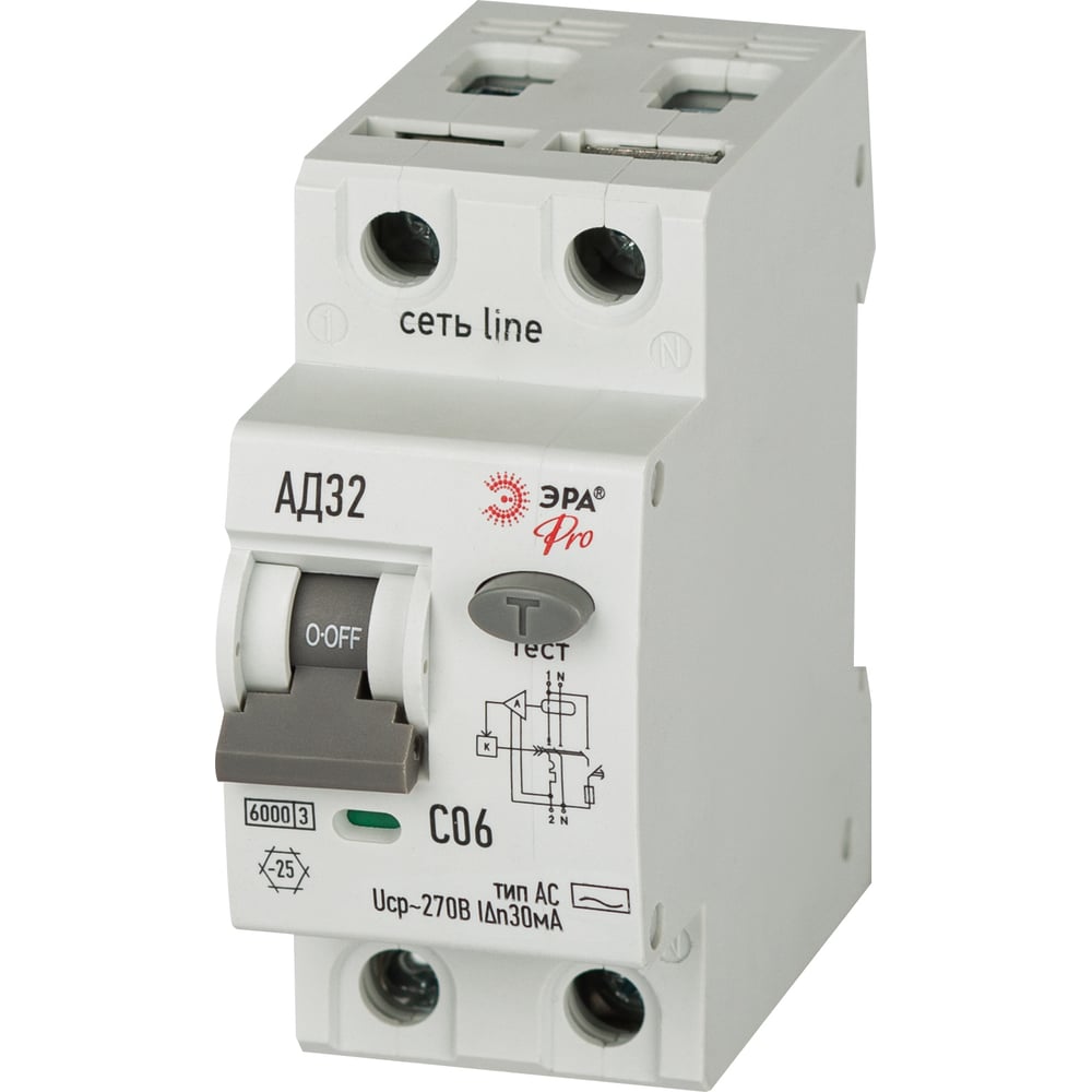 Автоматический выключатель дифференциального тока ЭРА 6кА PRO D326E2C06АC30P АД32 электронное 1PN C06 30мА тип АC защита 270В Б0059109