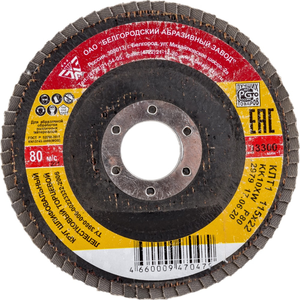 Тип КЛТ 1 (плоский) Диаметр 115 мм Назначение универсальный Количество в упаковке 1 шт Установка на фланец Тип диска шлифовальный Материал подложки стекловолокно Посадочный диаметр 22.2 мм Материал основы лепестков х/б тканевая основа Зернистость (по FEPA, P) 80