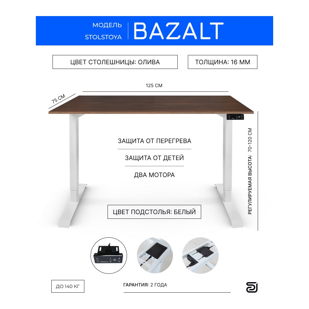 Письменный, компьютерный стол для работы сидя и стоя StolStoya BAZALT, белый, с электроприводом, столешница лдсп олива шоколад 125x75 SE222WO12575
