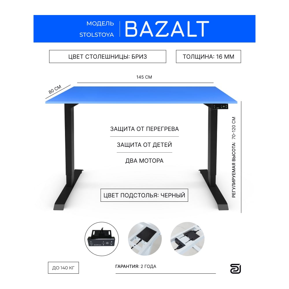 Письменный, компьютерный стол для работы сидя и стоя StolStoya BAZALT черный, регулируемый, с электроприводом, столешница лдсп бриз 145x80 SE222Bbz14580
