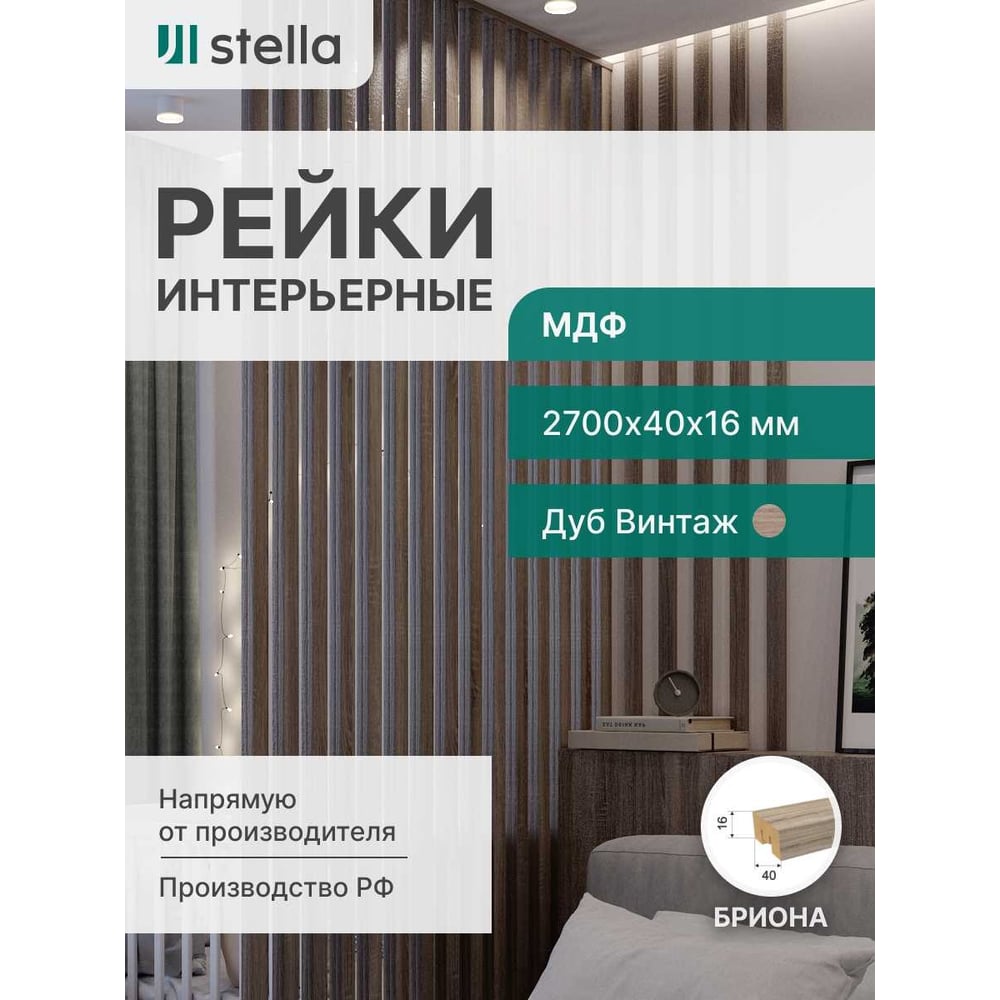 Интерьерная рейка STELLA Бриона МДФ, 16x40x2700 мм, Дуб Винтаж, упаковка 8 шт. ЦБ-00007389