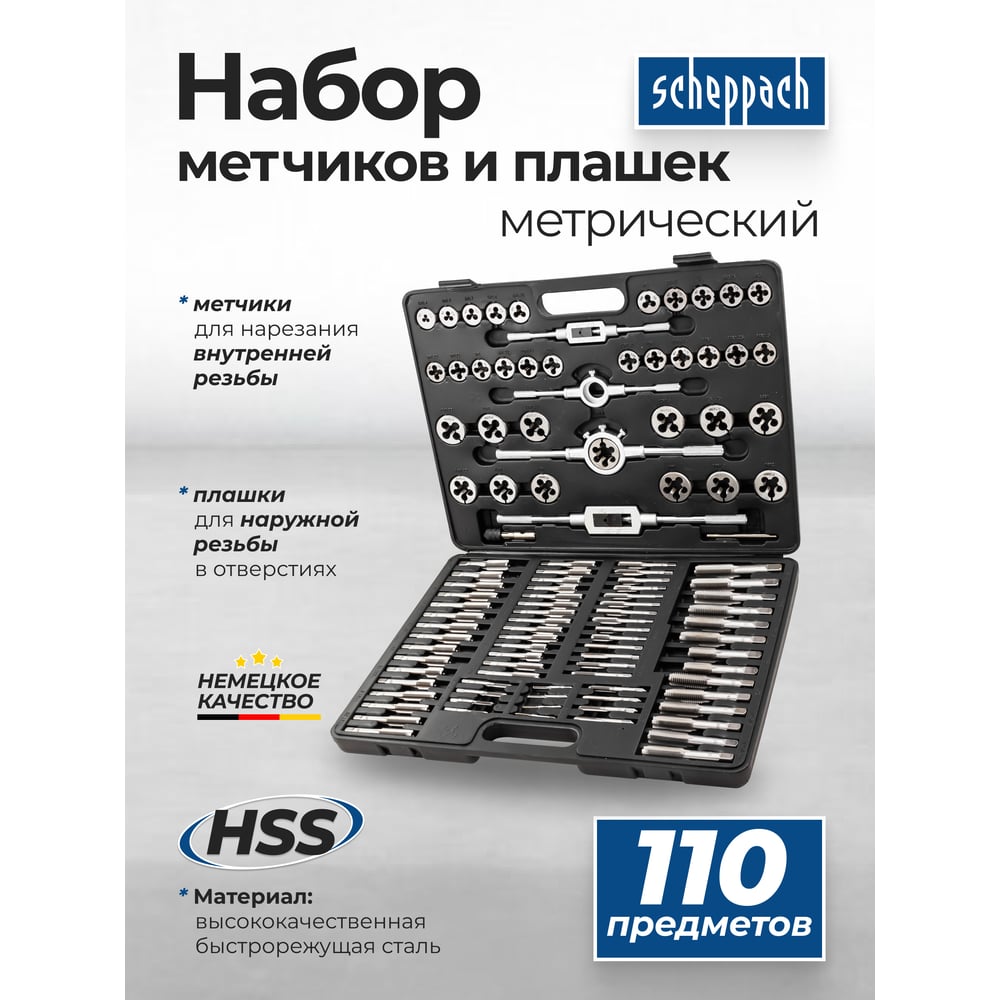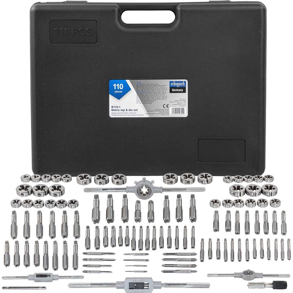 Набор метчиков и плашек Scheppach 110 предметов (2x0.4,3x0.5,4x0.7,5x0.8,6x0.75-1,8x0.75-1,25,9x0.75-1.25,10x0.75-1.5,11x0.75/1/1.25/1.5, 12x0.75-1.75,14x1-2,16x1-2,18x1.5) Sch-B110-1(64908)