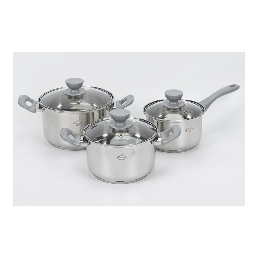 | Состав набора | 1 ковш с крышкой, 2 кастрюли с крышкой |