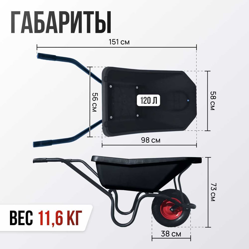 Строительная, одноколесная тачка Variant, с ЧЕРНЫМ ПЛАСТИКОВЫМ корытом, колесо 4.80/4.00-8, 120 л. 11120ЧПК