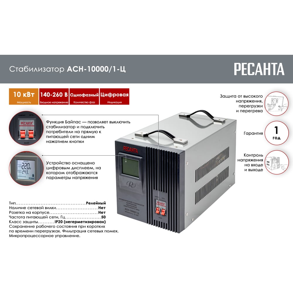 Однофазный стабилизатор напряжения Ресанта АСН 10000/1-Ц 63/6/8