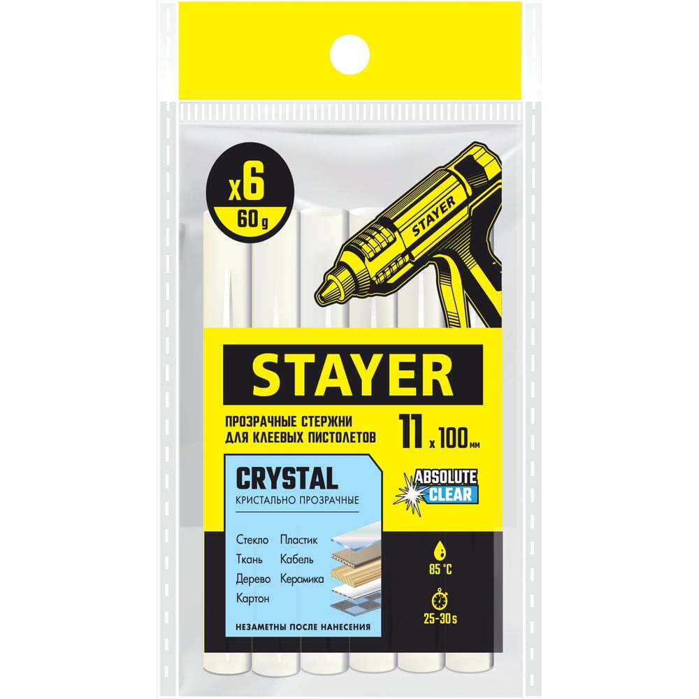 Стержни клеевые прозрачные, универсальные 11х100 мм, 6 шт, STAYER Professional Cristal 0682-H6