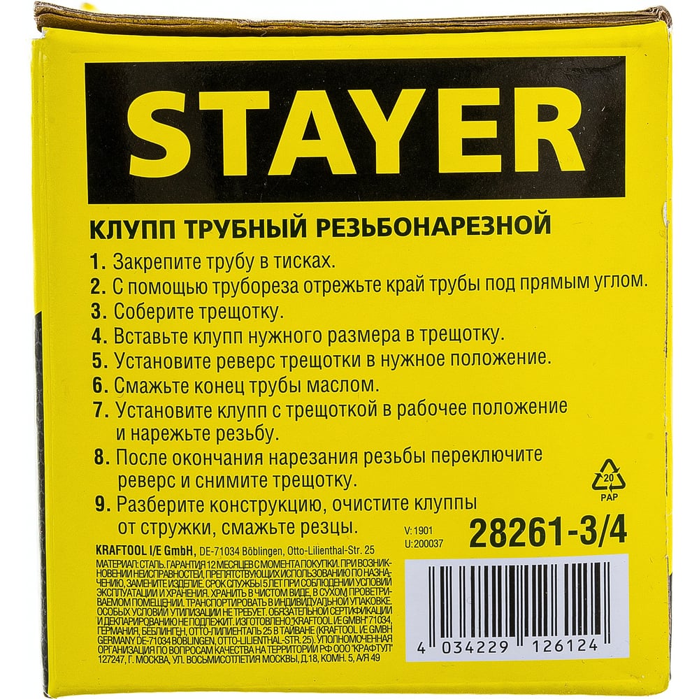 Трубный резьбонарезной клупп STAYER 3/4" 28261-3/4