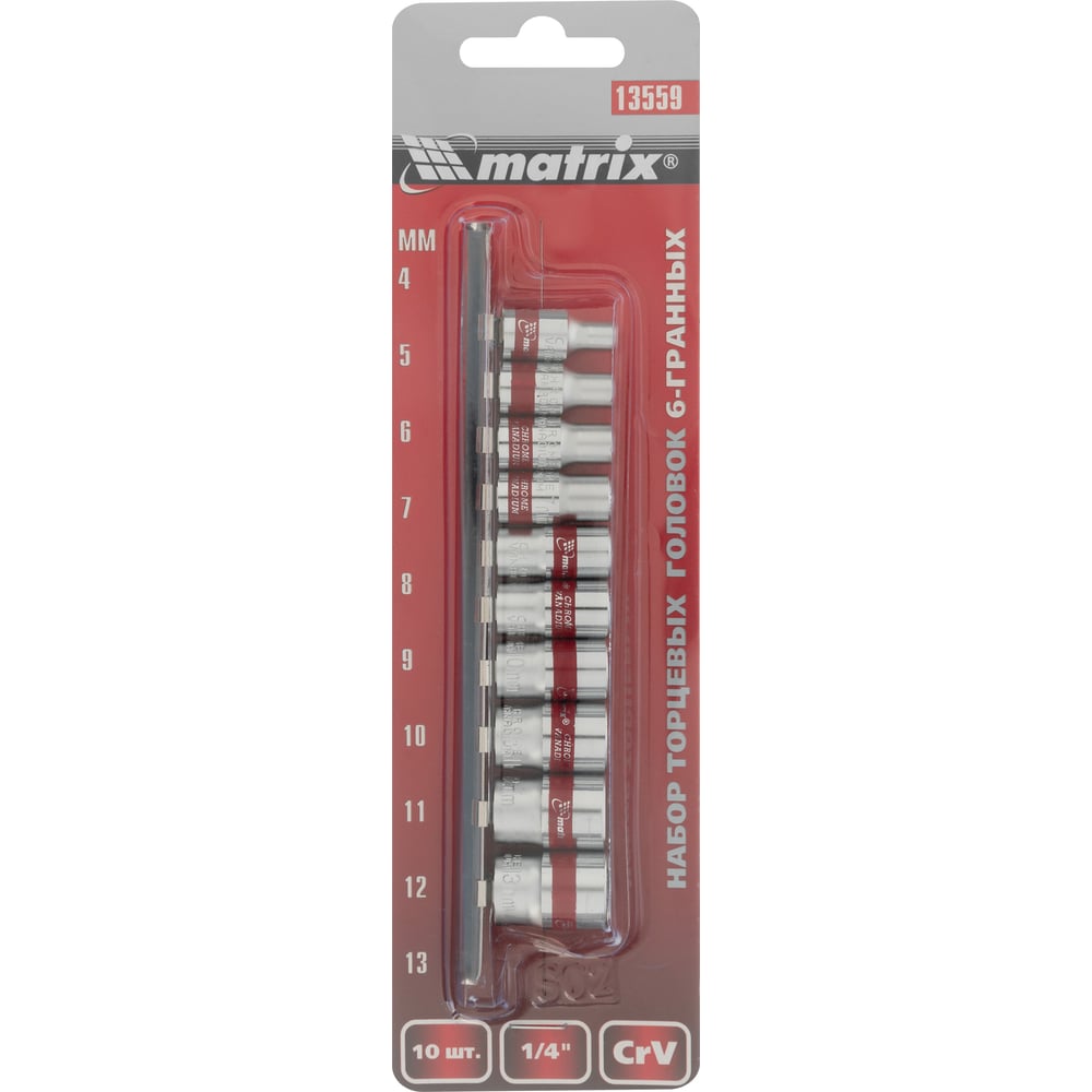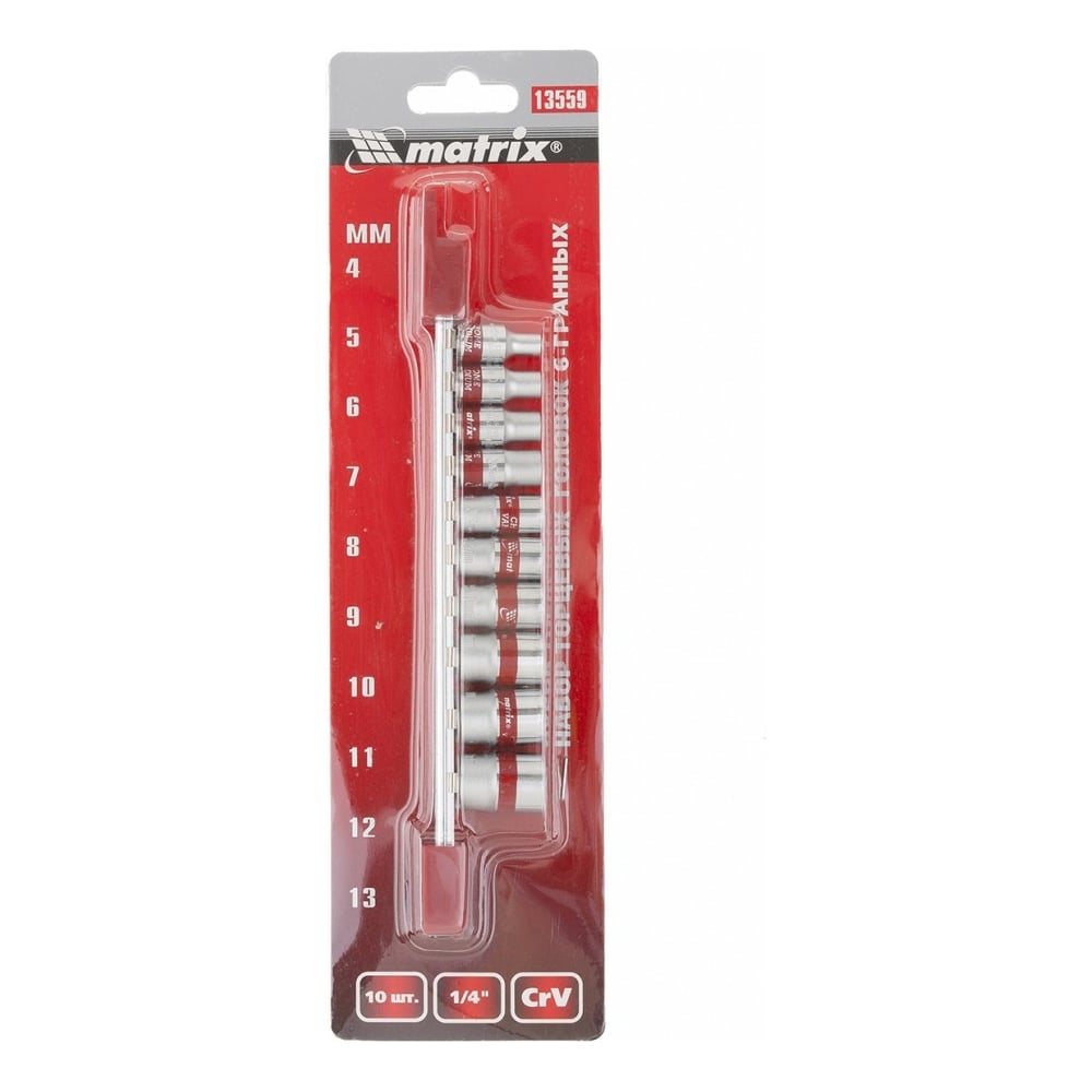Набор торцевых головок 1/4", 6-ти гр., CrV, 10шт., 4-13мм MATRIX 13559