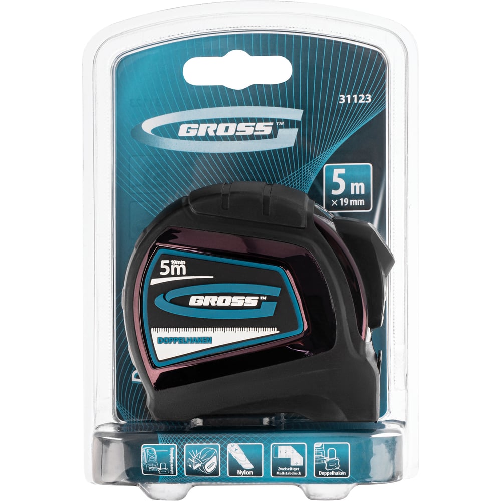 Рулетка Doppelhaken 5мх19мм, двухсторонний зацеп, нейлон, двуст.шкала GROSS 31123