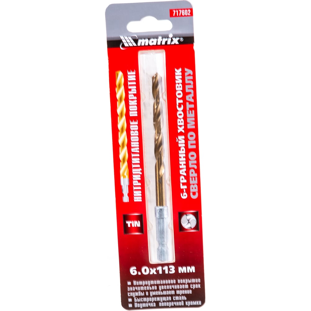 Сверло по металлу, 6 мм, HSS, нитридтитановое покрытие, 6-гранный хвостовик MATRIX 717602