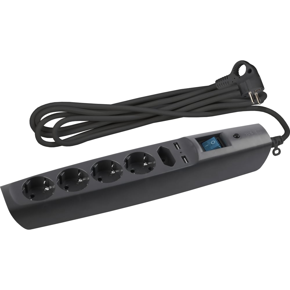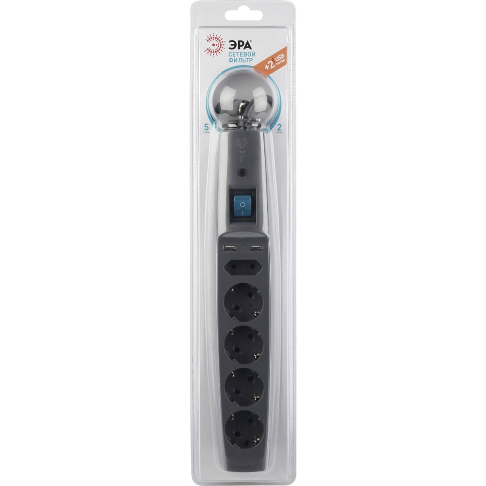 Сетевой фильтр 5 розеток, 2 USB, 2м, с/з, шторками и выключателем, черный, SFU-5es-2m-B ЭРА C0043326
