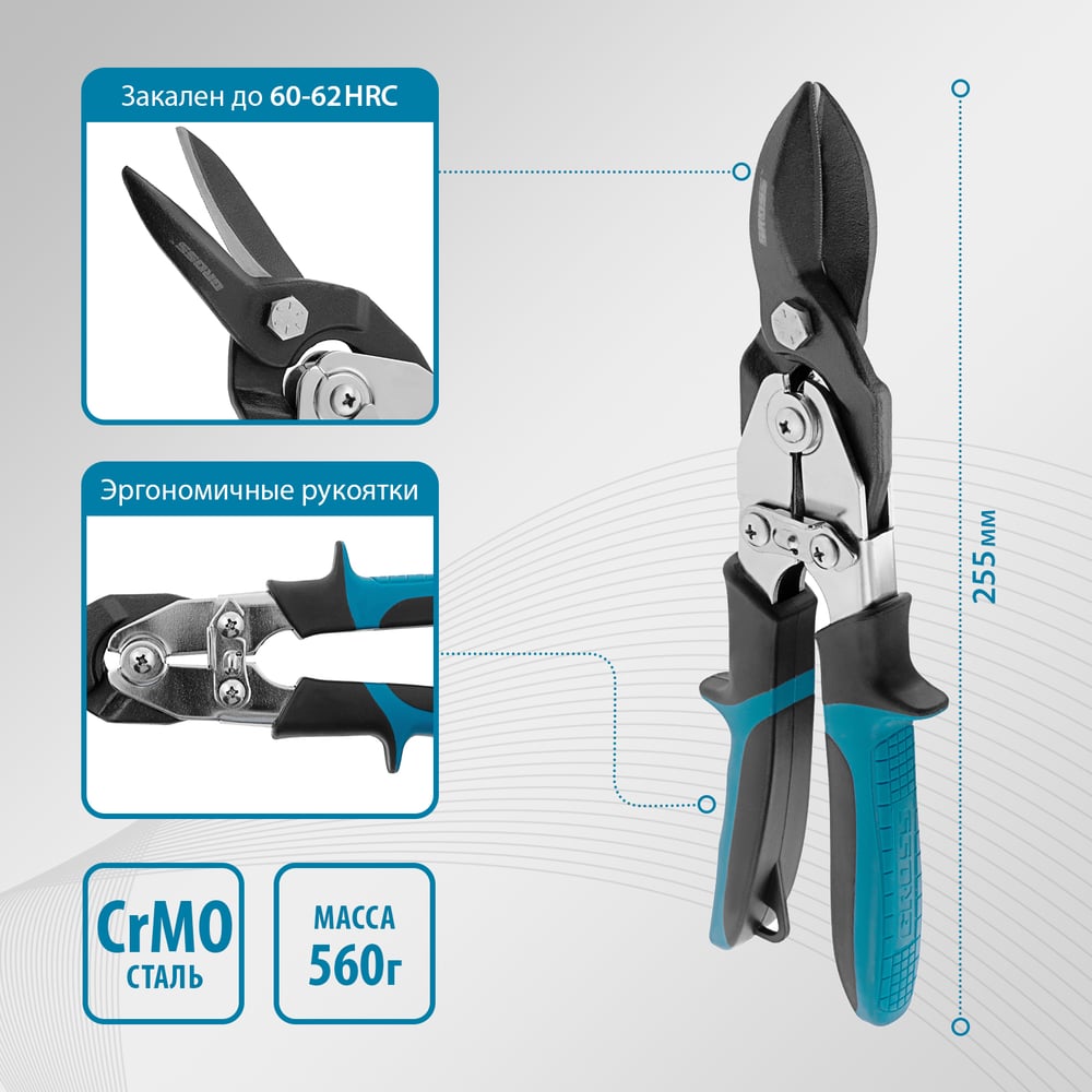 Усиленные прямые ножницы по металлу GROSS PIRANHA 255 мм, сталь-СrMo, двухкомпонентные рукоятки 78347