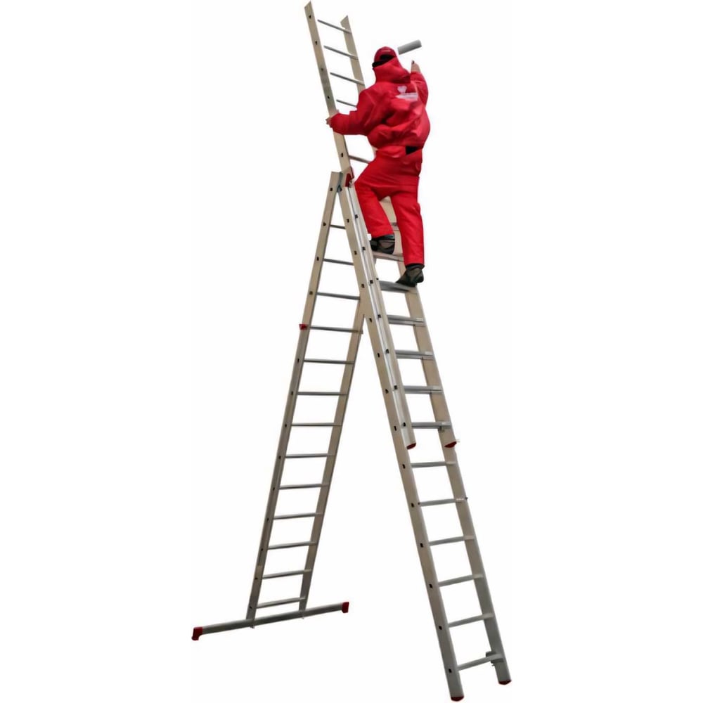 Материал алюминий Тип трехсекционная Класс товара Профессиональный Вес нетто 16.2 кг Размер в сложенном состоянии 234х35 см Рабочая высота 6.05 м Max рабочая нагрузка 150 кг Общая длина 5.02 м Ширина ступеней 28 мм Ширина лестницы 350 мм min длина в сложенном состоянии 2.34 м Количество ступеней 3х9 шт Толщина профиля 1.25 мм Телескопическая нет Регулировка опоры угловой траверсы нет Max длина 5.02 м Min длина 2.34 м