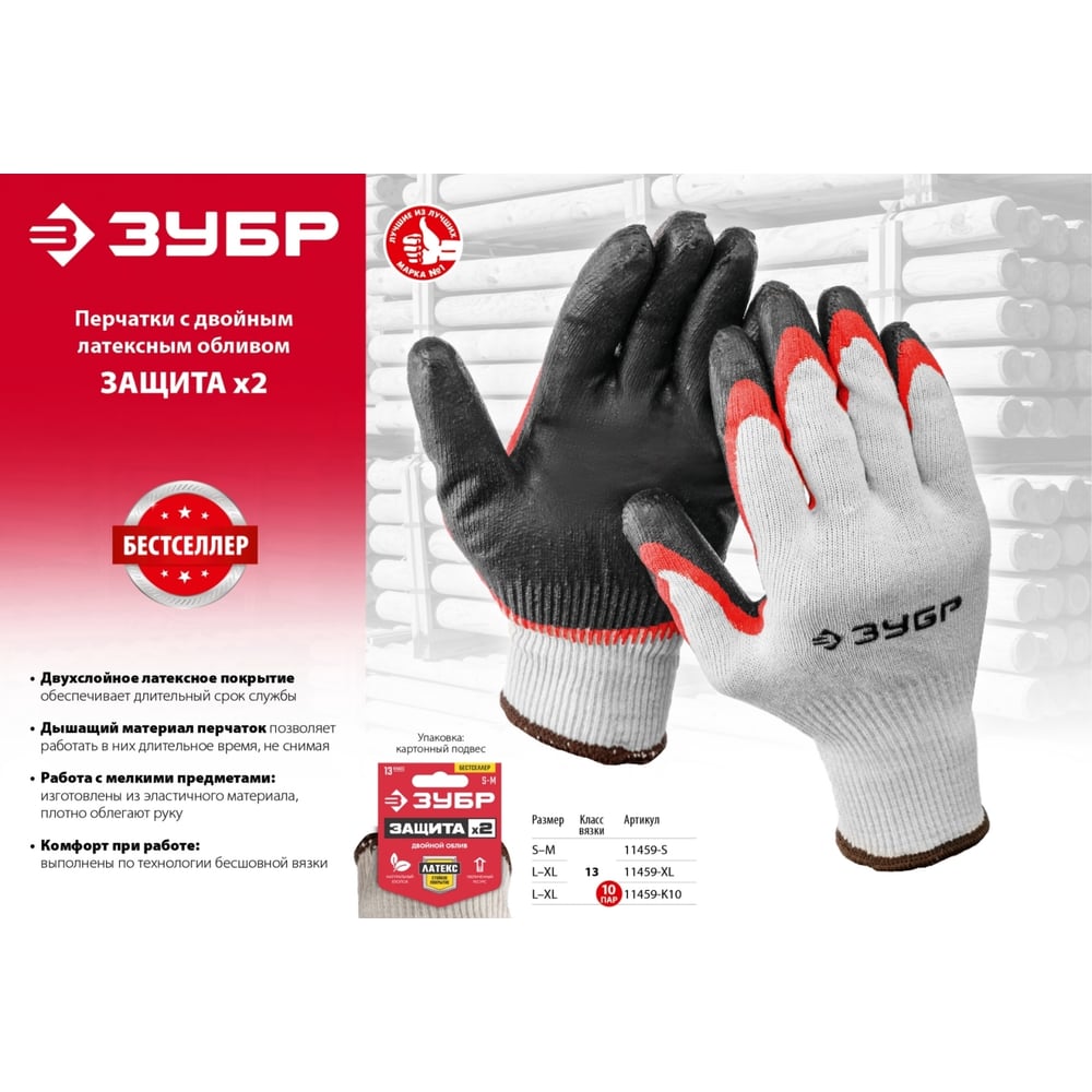 Трикотажные перчатки с двойной обливной ладонью из латекса ЗУБР р. L-XL, 10 пар 11459-K10