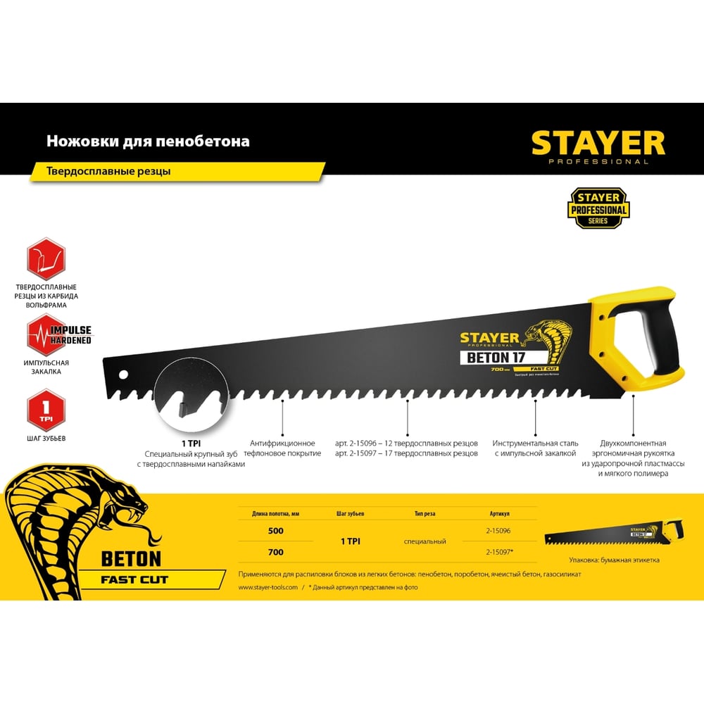 Ножовка по пенобетону Stayer Beton Cut 500 мм, шаг 20 мм, 12 твердосплавных резцов 2-15096