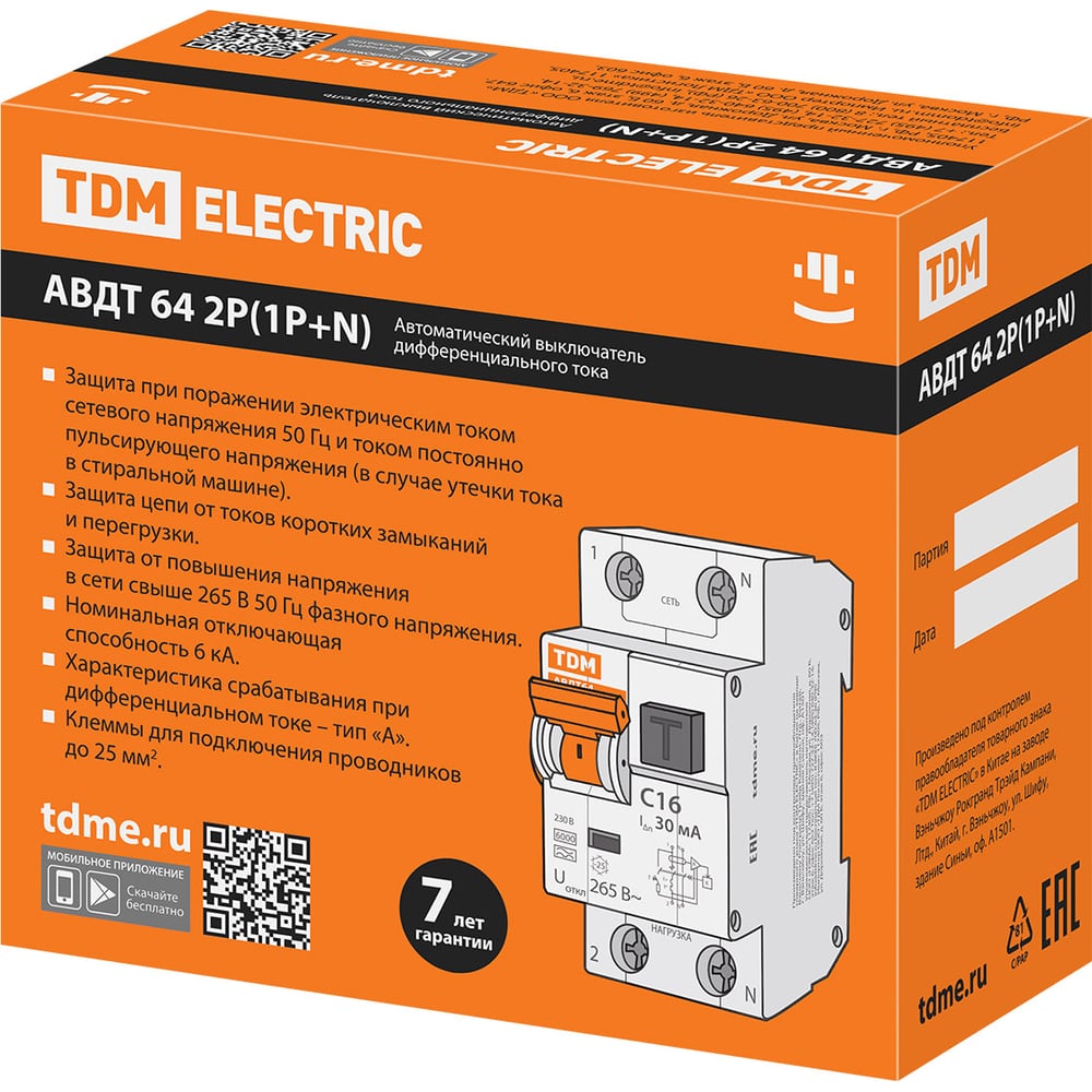 Автоматический выключатель дифференциального тока АВДТ (дифавтомат) 64 TDM ELECTRIC 2Р(1Р+N) C63 100мА тип А защита 265В SQ0205-0014