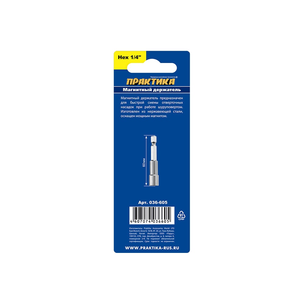Держатель магнитный цельнотянутый (60 мм) ПРАКТИКА 036-605