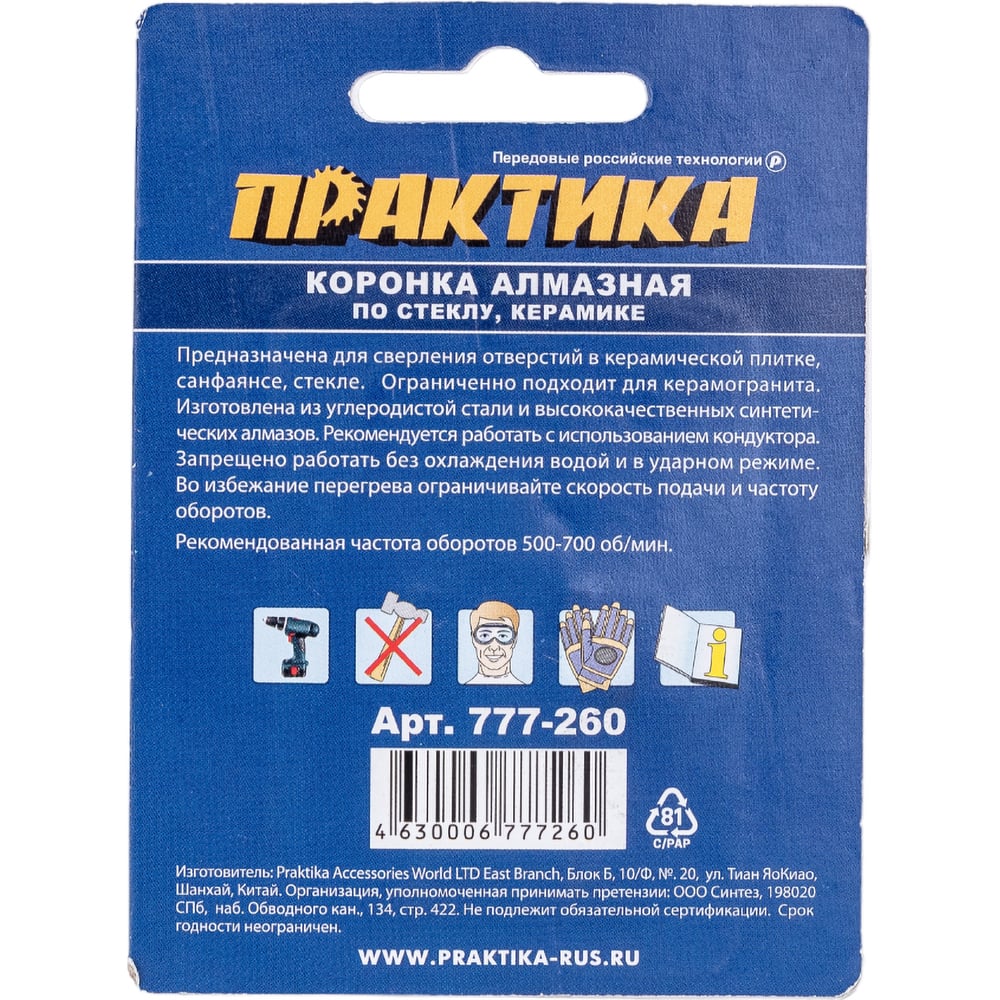 Алмазное сверло по керамике и стеклу ПРАКТИКА 777-260