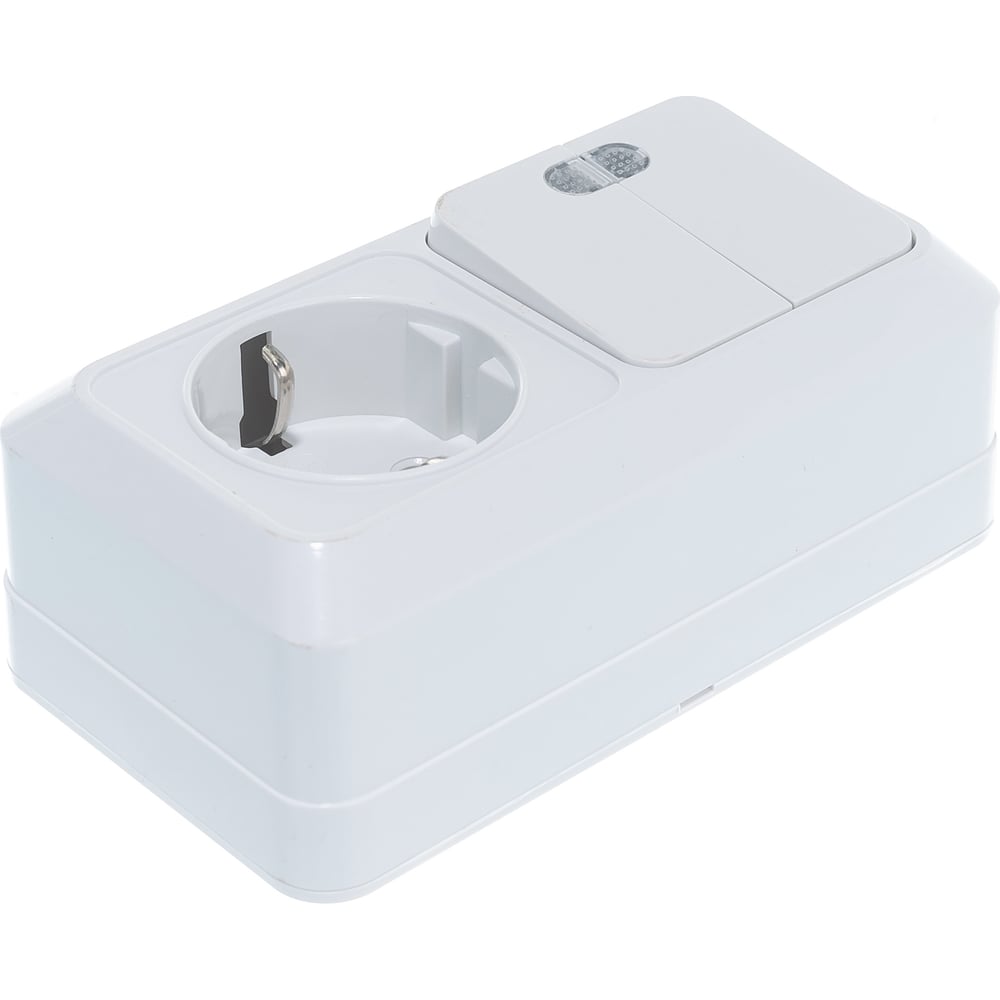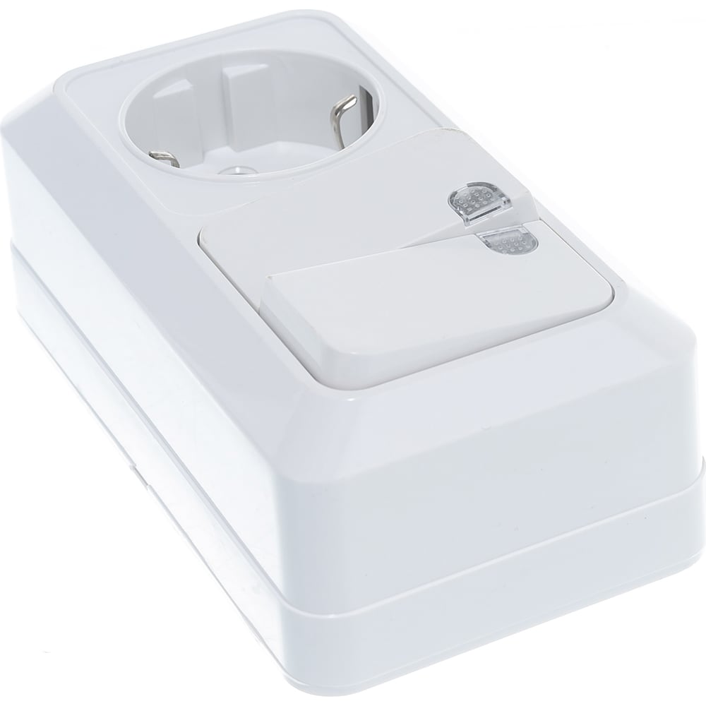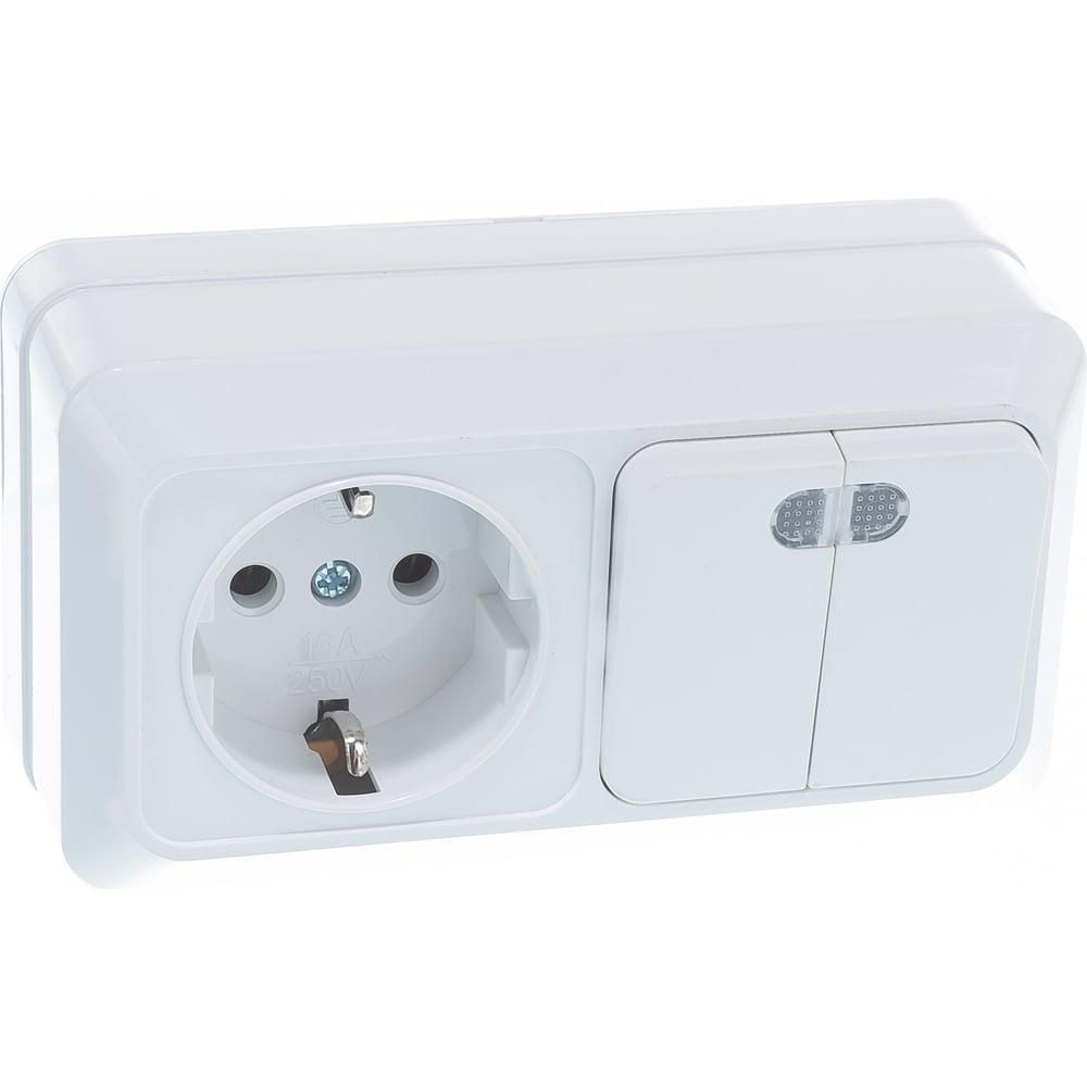 Горизонтальный блок: двухклавишный выключатель c подсветкой + розетка с заземлением, белый UNIVersal Олимп О0037