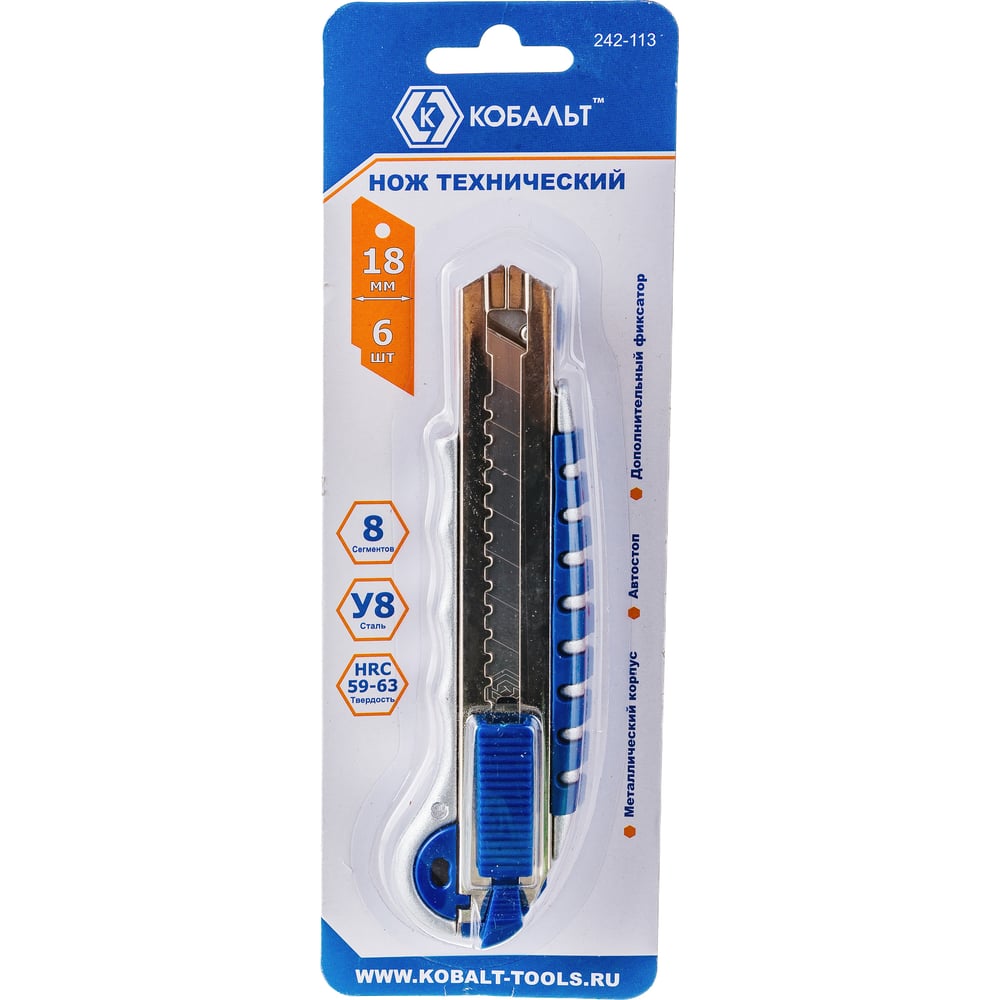 Технический нож, лезвия 18мм 6шт, металлический корпус, автостоп, доп.фиксатор КОБАЛЬТ 242-113