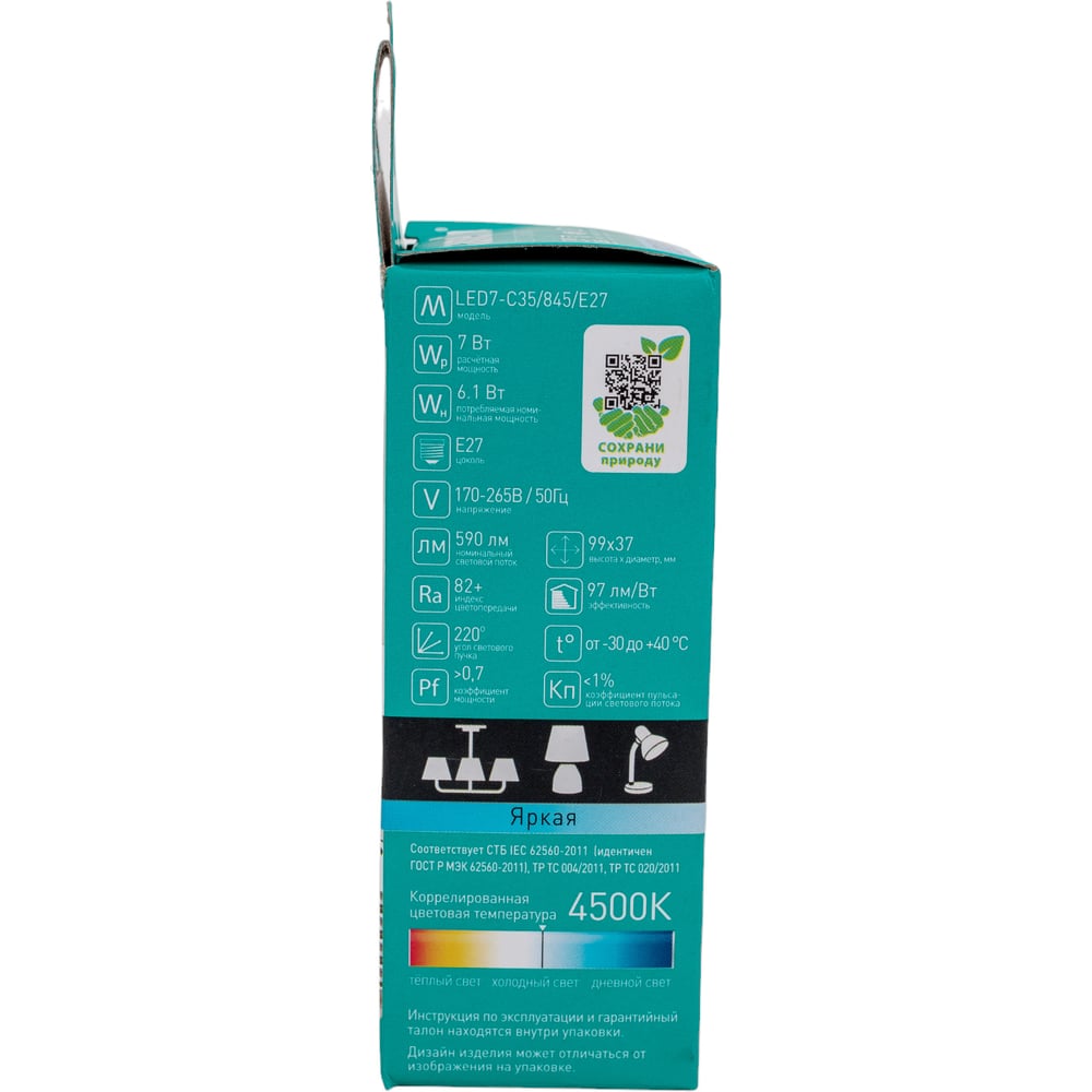 | Эквивалент лампы накаливания | 60 Вт |