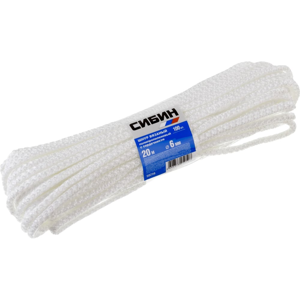 Вязаный полипропиленовый шнур с сердечником, белый, длина 20м, диаметр 6мм СИБИН 50256