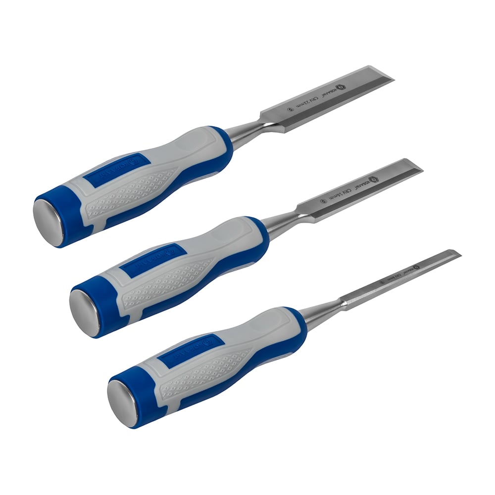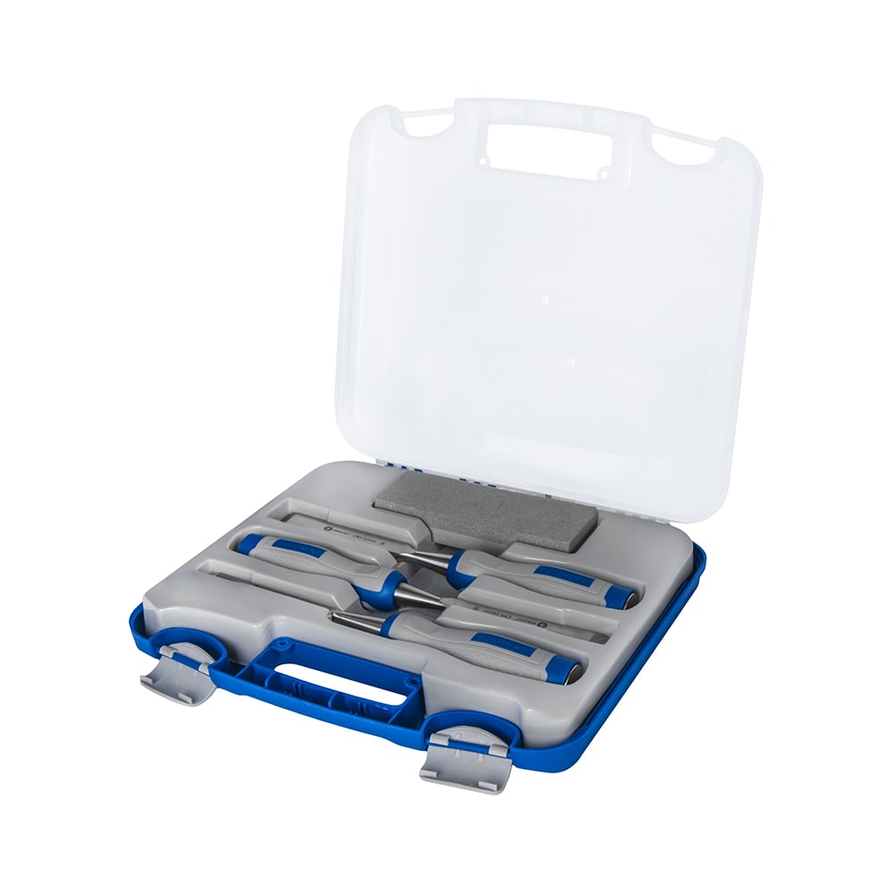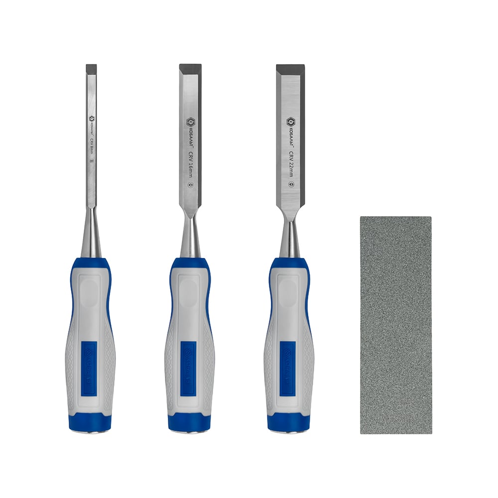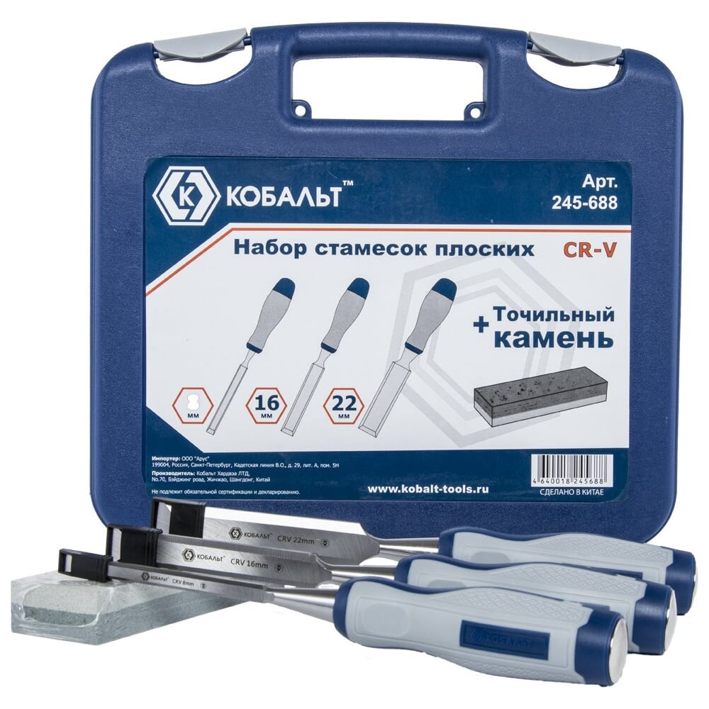 Набор плоских стамесок: 8, 16, 22мм, длина 140мм, CR-V, двухкомпонентные рукоятки, точильный камень, 3шт, кейс КОБАЛЬТ 245-688