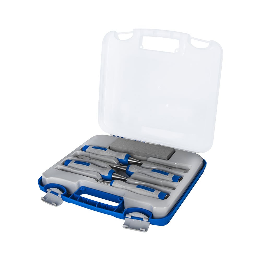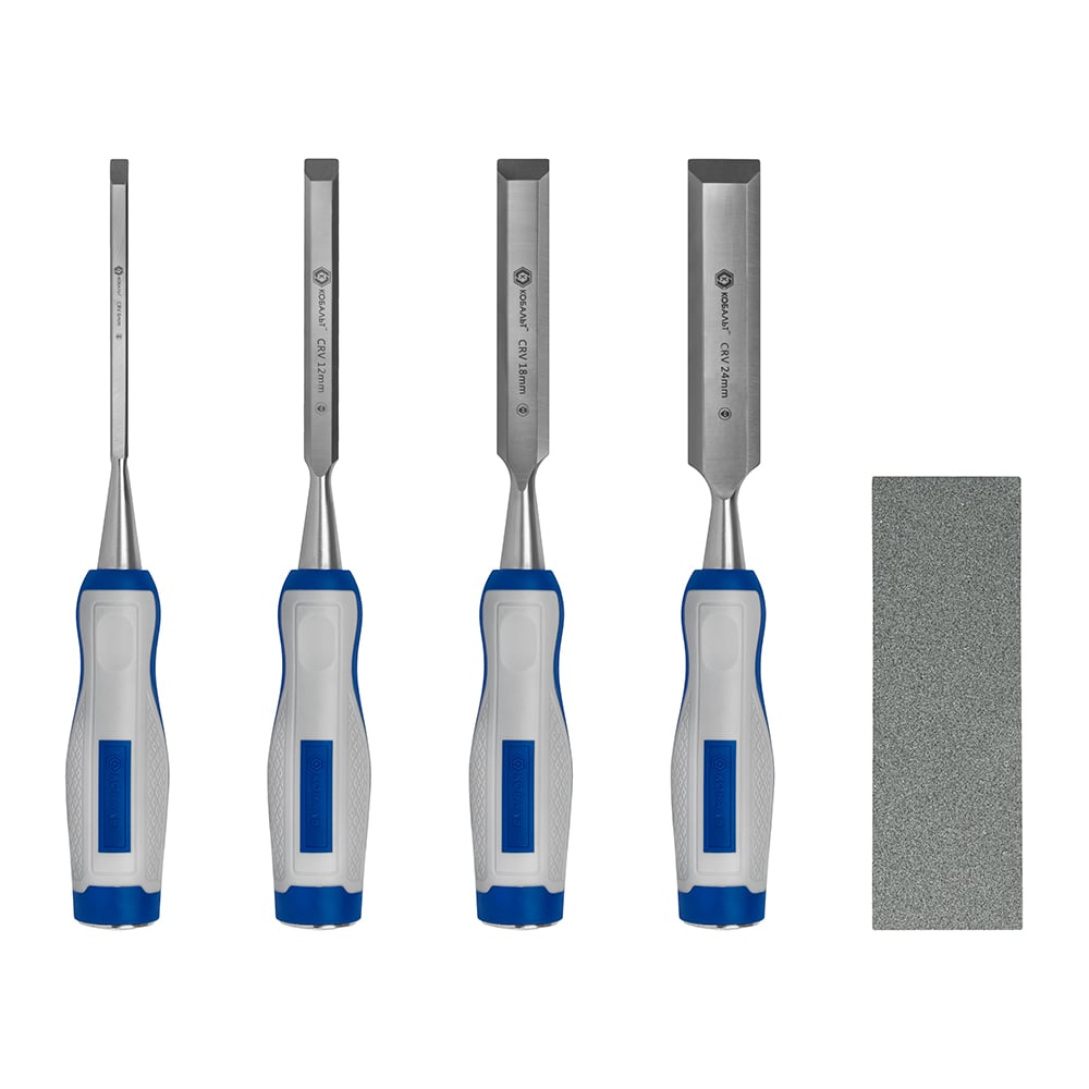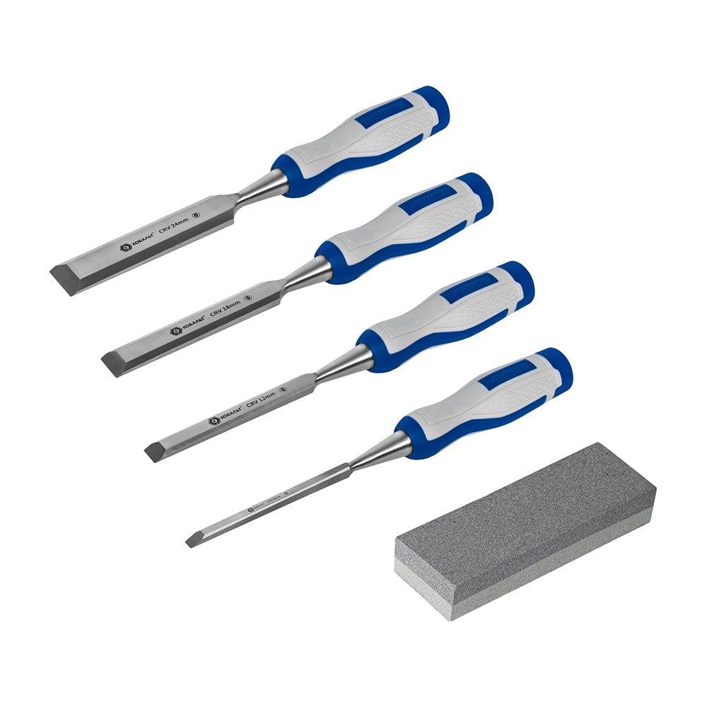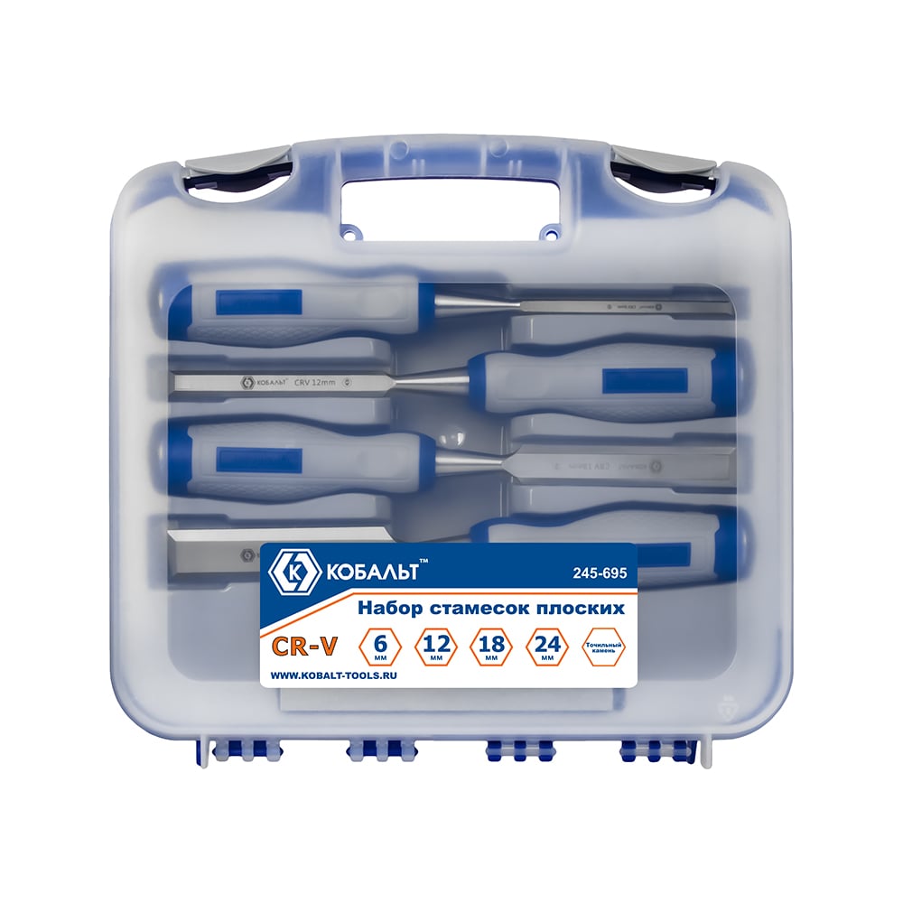 Набор плоских стамесок: 6, 12, 18, 24мм, длина 140мм, CR-V, двухкомпонентные рукоятки, точильный камень, 4шт, кейс КОБАЛЬТ 245-695