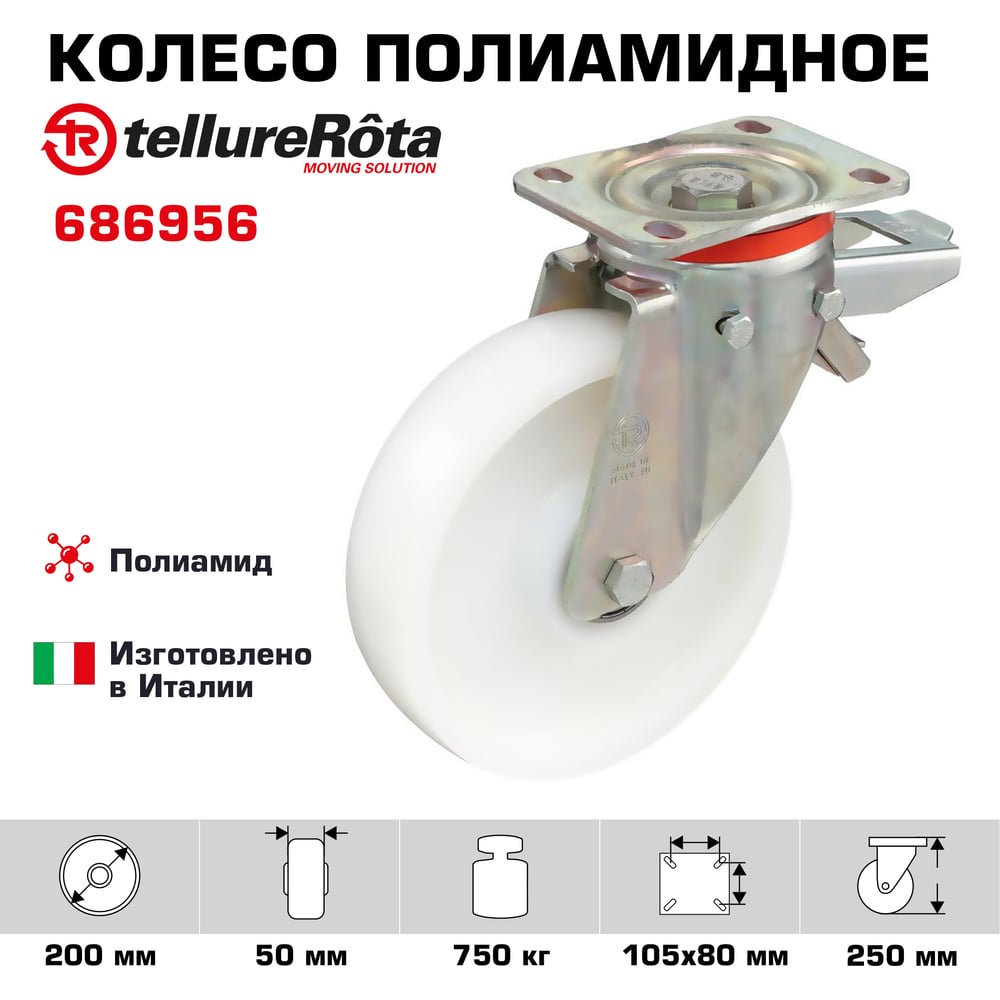 Колесо с вращающейся опорой, пластиной крепления и задним тормозом (200 мм; 750 кг) Tellure rota 686956
