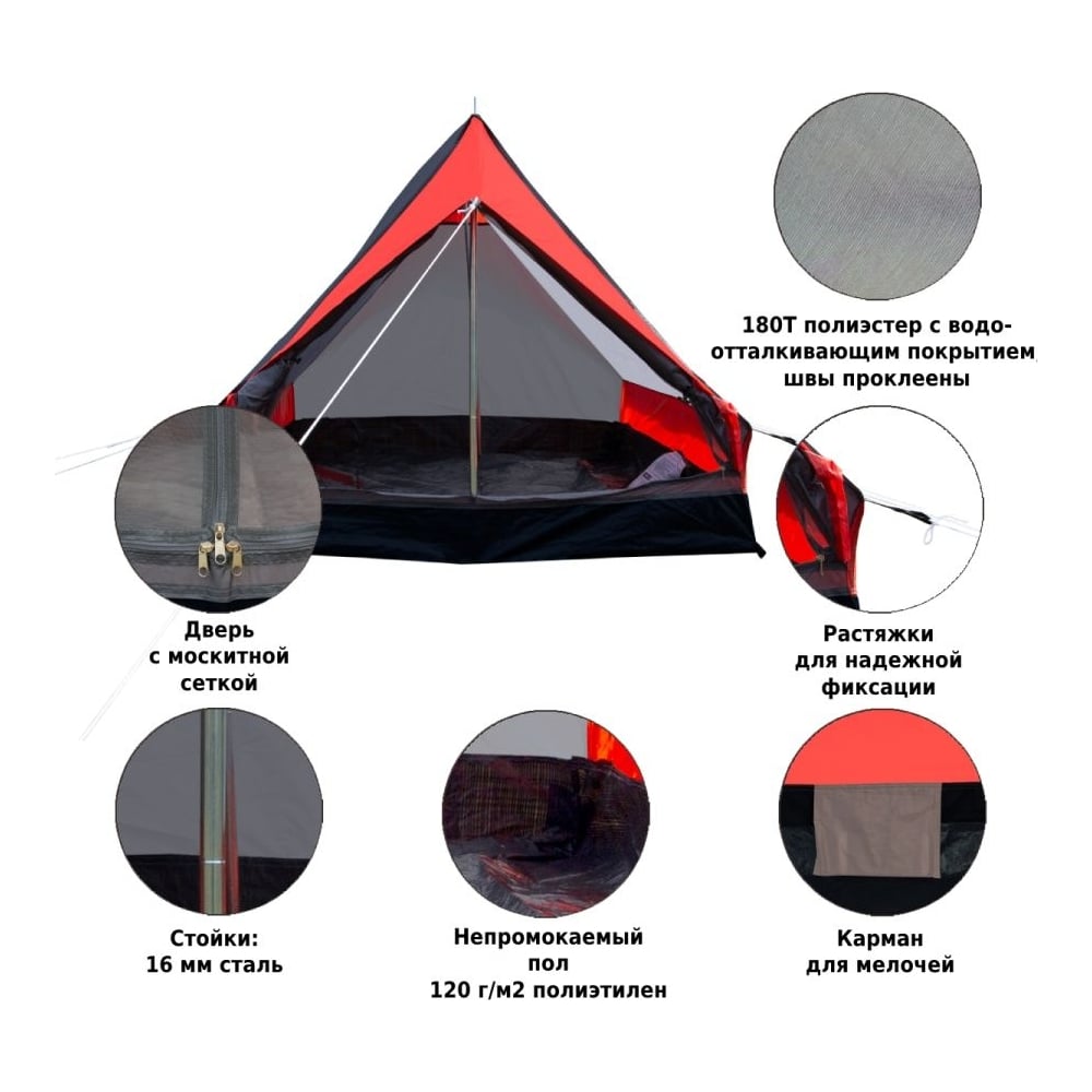 | Влагостойкость | для непродолжительных моросящих дождей (низкая / до 1000мм водяного столба для внешнего тента) |
