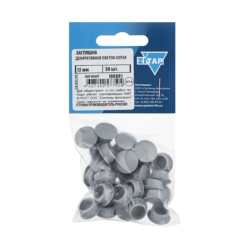 Декоративная заглушка 12 мм, светло-серая, 30 шт, пакет Zitar 108881
