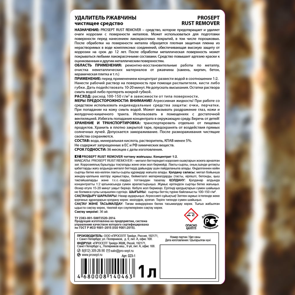 Удалитель ржавчины RUST REMOVER (концентрат 1:2) 1 л PROSEPT 023-1