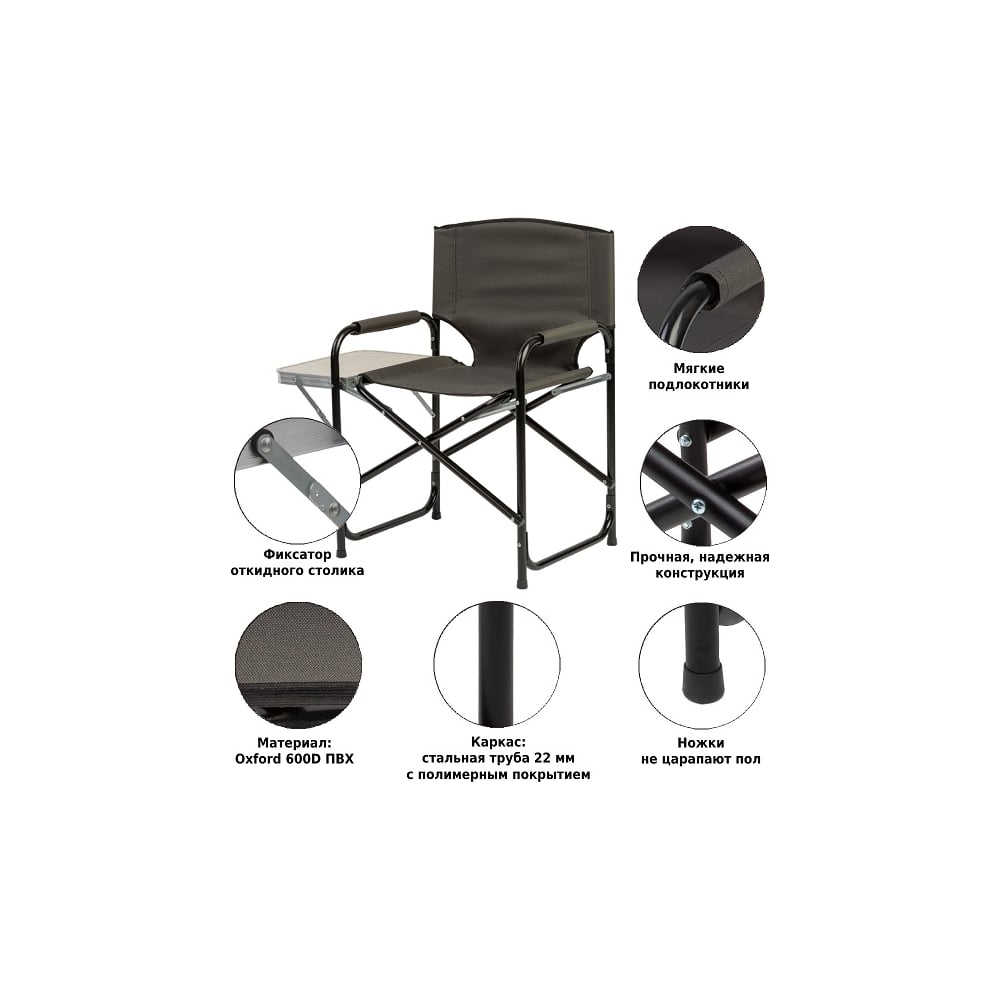 Высота 830 мм Подлокотники да Max нагрузка 110 кг Цвет сиденья хаки Высота сиденья 370 мм Материал каркаса сталь Материал сиденья Оксфорд (Oxford) Габариты в разложенном виде 560х470 мм Габариты в сложенном виде 830х470х95 мм Наличие подстаканника нет Со столиком да